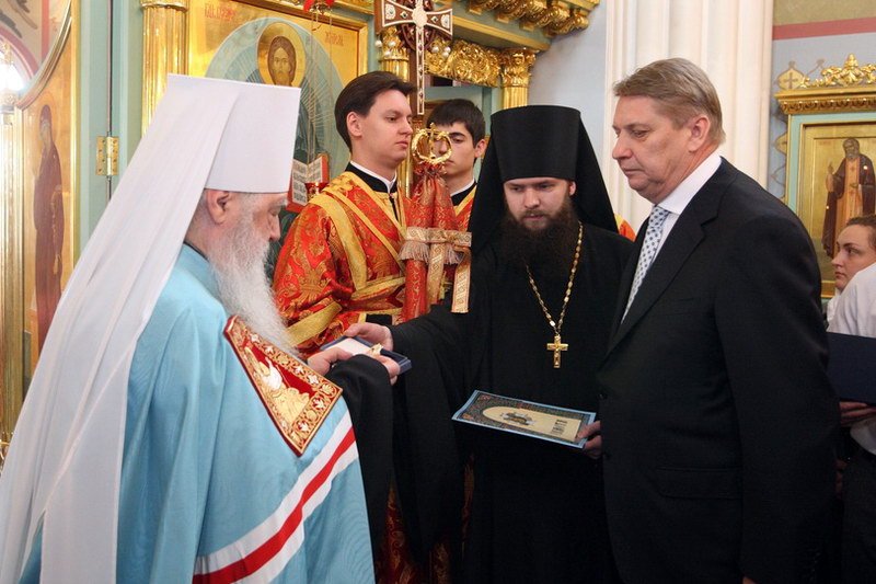 После награждения Игорь Викторович Ларин обратился к присутствующим со словом: «Ваше Высокопреосвященство, дорогой и горячо любимый Владыка! Сегодня я переживаю очень волнительные минуты, поскольку слова, сказанные вами здесь, в этом храме, сказаны не только в знак благодарности, но и в знак назидания на будущие дела. Я с радостью вспоминаю часы первого нашего знакомства на этом предприятии, когда во время вашего посещения мы посадили небольшие саженцы берёз. Они сегодня выросли и, расправив свои ветви над предприятием, дали глубокие корни. Это знак того, что те дела, на которые вы нас благословили, распространяются все шире и шире. Те успехи, которые в течение многих лет предприятие переживало, были достигнуты с помощью Божией. Когда у нас появилась возможность отблагодарить Господа за то, что Он помогает и укрепляет нас, мы приняли решение построить этот храм. Обратились к вам с просьбой благословить строительства. Мы с благодарностью приняли это благословение. Чудесным образом менее чем за два года был построен этот храм и здание, которое к нему примыкает, где расположено церковное помещение и просфорный цех. Те дни, когда строился храм, все сотрудники, принимавшие участие в этом богоугодном деле, с радостью сопереживали каждый день. Приходя сюда, участвовали в различных мероприятиях. Эта радость перешла сюда после того, как был освящен храм. Все, кто приходит в этот храм, получают Божию благодать и помощь. Во время строительства мы неоднократно чувствовали всесильную поддержку Божией Матери, которая проявлялась в разных событиях. Это нас укрепляло. Находясь в этом храме во время служб, я испытываю особую радость, когда люди с детьми во множестве приходят сюда, исповедуются и приобщаются к Церкви. Эти чувства нельзя ни с чем сравнить, потому что они дают ту радость, которую ничем нельзя заменить. Наблюдая за последними событиями, которые мы все знаем, событиями, связанными с давлением на Церковь со стороны тех сил, которым не нравится этот процесс, и они хотят ему противостоять, нас это сильно огорчает, но в то же время и укрепляет. Если обратиться к истории Церкви и государства, то мы вспомним, что, когда такие процессы начинались и их вовремя не останавливали, то наше государство и народ подвергались страшным событиям. Та реакция, которая сегодня в нашем российском народе проявилась, – это знак того, что люди понимают главный путь – путь спасения.