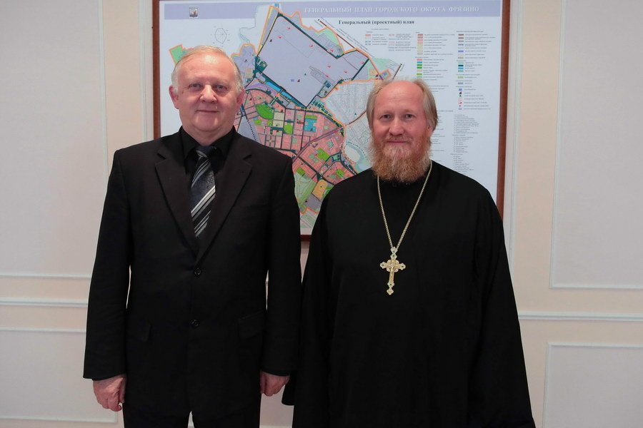 С главой города Фрязино в этот день решались рабочие вопросы о строительстве храма в честь Державной иконы Божией Матери, в ходе беседы были окончательно решены вопросы, связанные с выделением земли и месторасположением храма и духовно-просветительского центра.