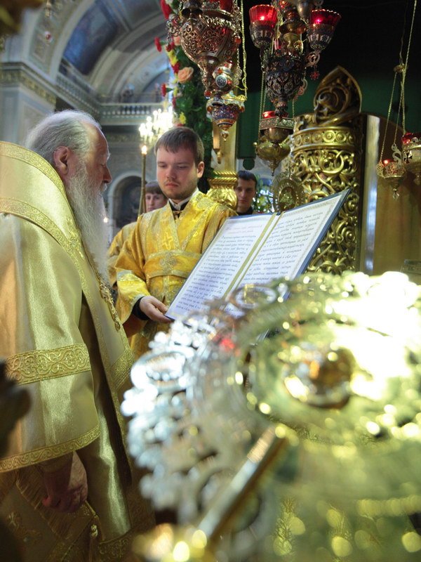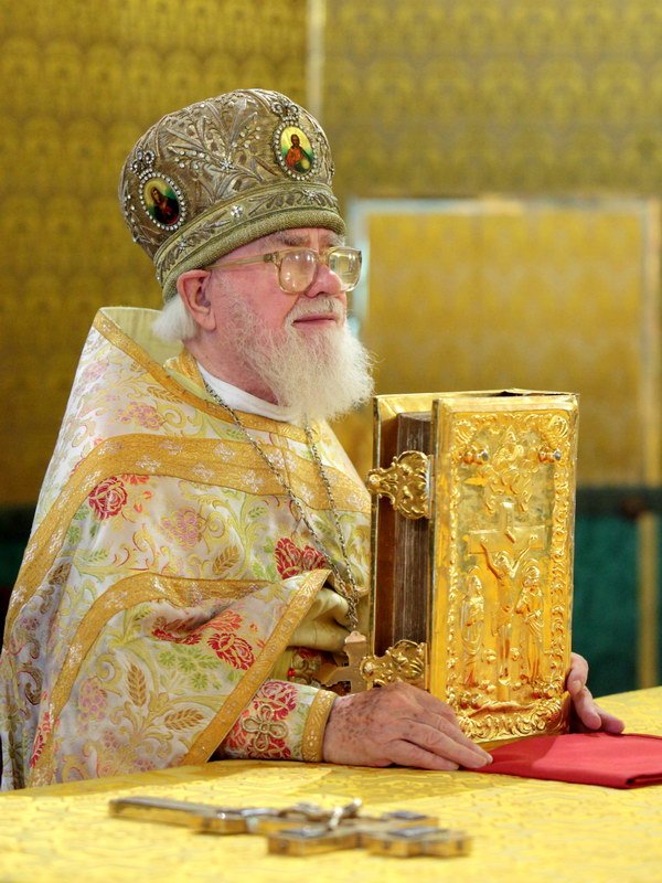 «Дорогие и возлюбленные братья и сестры! Сердечно поздравляю вас с памятью святителя Христова и чудотворца Алексия, именников с Днем ангела, причастников и причастниц с принятием Святых Христовых Таин! Сегодня, когда празднуется обретение святых и многоцелебных мощей святителя и чудотворца Алексия, в тропаре называют их „сокровищем пребогатым“. И далее говорится о том, что молящиеся, которые обращаются с молитвой к святителю Алексию, духовно обогащаются и исцеляются. Не случайно так верует Святая Церковь, потому что святитель Алексий еще при жизни своей милостию Божией и верой совершал чудеса. Праведники во веки живут, и поэтому с кончиной святых не прекращается наша духовная связь с ними. Они также как при жизни, с одной стороны, назидают нас своим праведным житием, а, с другой, остаются нашими молитвенниками и небесными ходатаями пред Богом. В 1947 году из Кремля были перенесены в этот собор мощи святителя Алексия, и с тех пор каждый верующий человек мог приступать с молитвой к цельбоносным мощам святителя Христова. Не иссякает поток людей в этот храм, и это является живым свидетельством, что святитель Алексий и ныне является помощником, целителем душ и телес наших. Святитель Алексий при своей жизни был святым монахом, великим святителем и строителем единства нашей земли. Никогда не был он в праздности и спокойствии, потому что и дела церковные, и жизнь политическая на Руси требовала от него постоянного внимания, усердных трудов и молитв. И мы счастливы, дорогие братья и сестры, что имеем на Руси такого великого молитвенника и предстателя за нас и можем поклоняться его святым и многоцелебным мощам. Я рад, что Святейший Патриарх Кирилл благословил нам сегодня совершить здесь Божественную литургию и молитву святителю. Мы верим, что Господь слышит эти молитвы и исполнит во благих прошения наши. Пусть благословение великого угодника Божия, покровителя и защитника русской земли пребывает со всеми нами и с нашим возлюбленным Отечеством. Аминь».