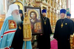На праздник принято дарить что то, чтобы это напоминало о совместной молитве. Я недавно посещал город Зарайск, где впервые служил много лет назад, как епископ Зарайский. И там после богослужения мне подарили икону Христа Спасителя, копию с образа VI века, находящегося в Синайской обители. Я хотел бы эту икону оставить в вашем приходе, как благословение Божие, чтобы все вдохновлялись верой и любовью, а Господь хранил всех вас. Желаю всем вам спасения и во всем благого поспешения».