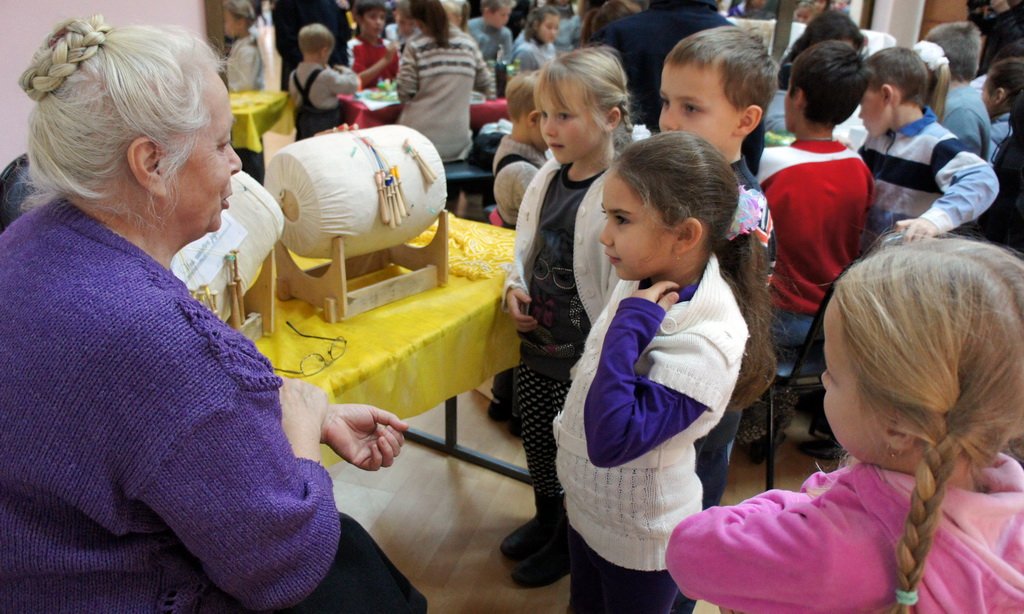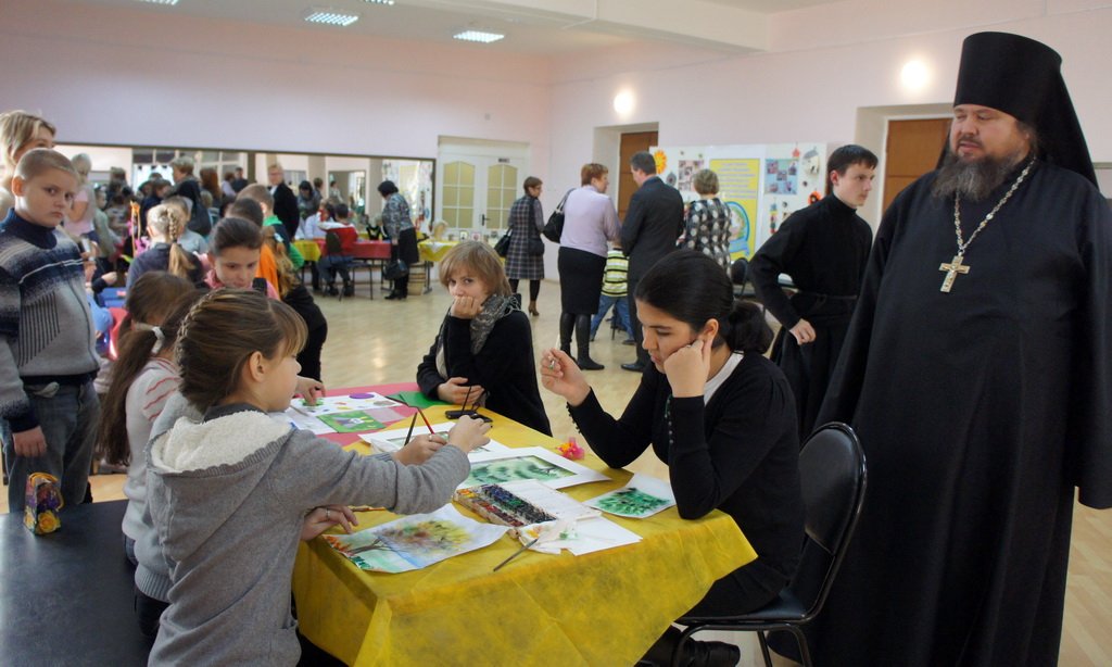 Общеепархиальная акция «Согреем детские сердца верой и любовью» в нынешнем году Павлово-Посадским благочинием была подготовлена совместно с районными управлениями социальной защиты населения, образования и управления по культуре, спорту и работе с молодежью. Кульминационный этап акции прошел 27 октября во Дворце культуры «Павлово-Покровский». По сравнению с прошлым годом увеличилось количество принимавших участие детей, в акции приняли участие 500 учащихся воскресных школ и школ-интернатов, а также сирот и опекаемых. Вход был по билетам, которые распространялись абсолютно бесплатно и были поровну поделены между приходами и госучреждениями района. На праздник были приглашены артисты из Москвы — театр-студия «Дали». В фойе актового зала для маленьких гостей было организовано множество мастер-классов. Роспись по ткани, бисероплетение, кружево, роспись по стеклу, резьба, рисование, поделки из различных материалов -детишкам было на что посмотреть и в чем попробовать свои силы. Скучать было некогда — каждый выбрал занятие по вкусу. А кто уже все посмотрел — шли пить чай со сладостями из огромного самовара. После приветственной речи ответственного за социальное служение в Павлово-Посадском благочинии игумена Амвросия (Шевчука) началось обещанное интерактивное представление. Талантливые актеры умело работали с юными зрителями.