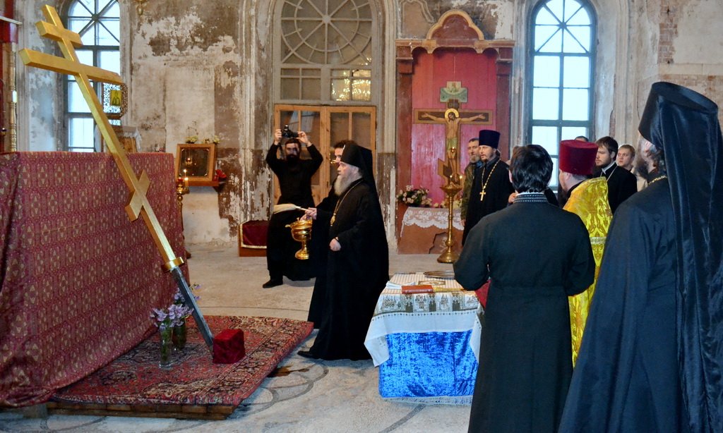После осмотра церковного дома Владыка Григорий освятил крест для колокольни Покровского храма деревни Пашнево, где в настоящее время продолжаются восстановительные работы.