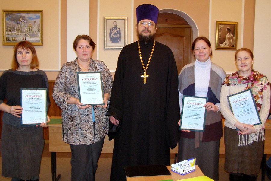 10 февраля в здании Духовно-просветительского центра «Благовест» Богородицерождественского собора г. Орехово-Зуево состоялось творческое занятие педагогов Школ искусств города и района с воспитанниками воскресной школы Богородицерождественского собора. Организовала и подготовила мероприятие координатор работы благочиния со светскими образовательными учреждениями Н. В. Фомичева, а открыл мероприятие клирик Богородицерождественского собора священник Михаил Таганов. Он подчеркнул важность творчества в развитии детей, напомнил о личной ответственности педагога за своих воспитанников. Затем он вручил сертификаты «За подготовку участника конкурса» педагогам Школ искусств, которые приняли участие в VIII Международном конкурсе детского творчества «Красота Божиего мира». Сертификаты получили А. Л. Куликова, Г. Р. Зиновкина, И. М. Моногарова и А. М. Самоткан. Затем для ребят был организован мастер-класс, на котором способом «рваной» аппликации дети сделали картины на тему «Ангел-хранитель».