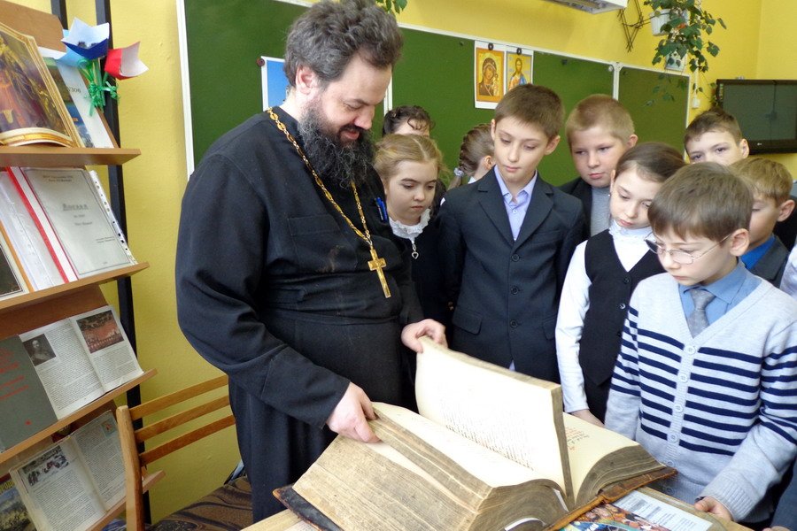 14 марта в Свердловской общеобразовательной школе в рамках урока «Основ православной культуры» прошла выставка старинных богослужебных книг. Настоятель Знаменского храма протоиерей Олег Гирба прочитал лекцию о празднике Дня православной книги и истории книгопечатания.