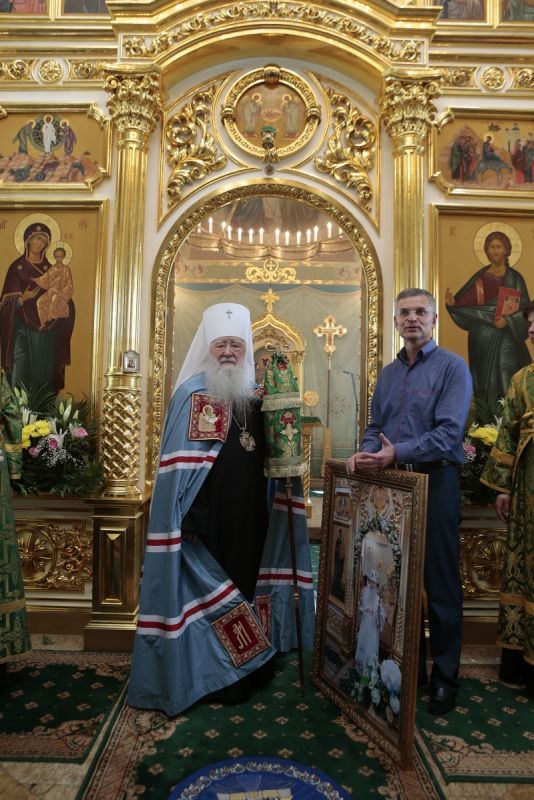 Я много уже слышал, как вы готовились к этому празднику, и очень трогательно, что сегодня во множестве собрались на совместную молитву. Я всех горячо и сердечно благодарю, особенно же Николая Александровича за его чудный дар! Хочу вам сказать, что в моем возрасте уже не собирают сокровищ, а обычно раздают, и поэтому я хотел бы, чтобы это дивное изображение в момент богослужения освящения этого храма осталось здесь, в этом приходе, и чтобы меня почаще сюда тянуло для того, чтобы посмотреть на него и вспомнить те минувшие годы, когда поруганный, забытый, разрушенный храм был возвращен Церкви и руками благотворителей восстановлен, и я думаю, что в первоначальном виде он не был такой прекрасный как сейчас. И сегодня, когда мы молились, как будто пребывали в Царстве Небесном. Хочется, чтобы вы чаще посещали этот храм, не только, когда к вам приезжает архиерей или когда бывают большие праздники, но когда душа потянется к Богу, будет духовная нужда испросить помощи Божией.