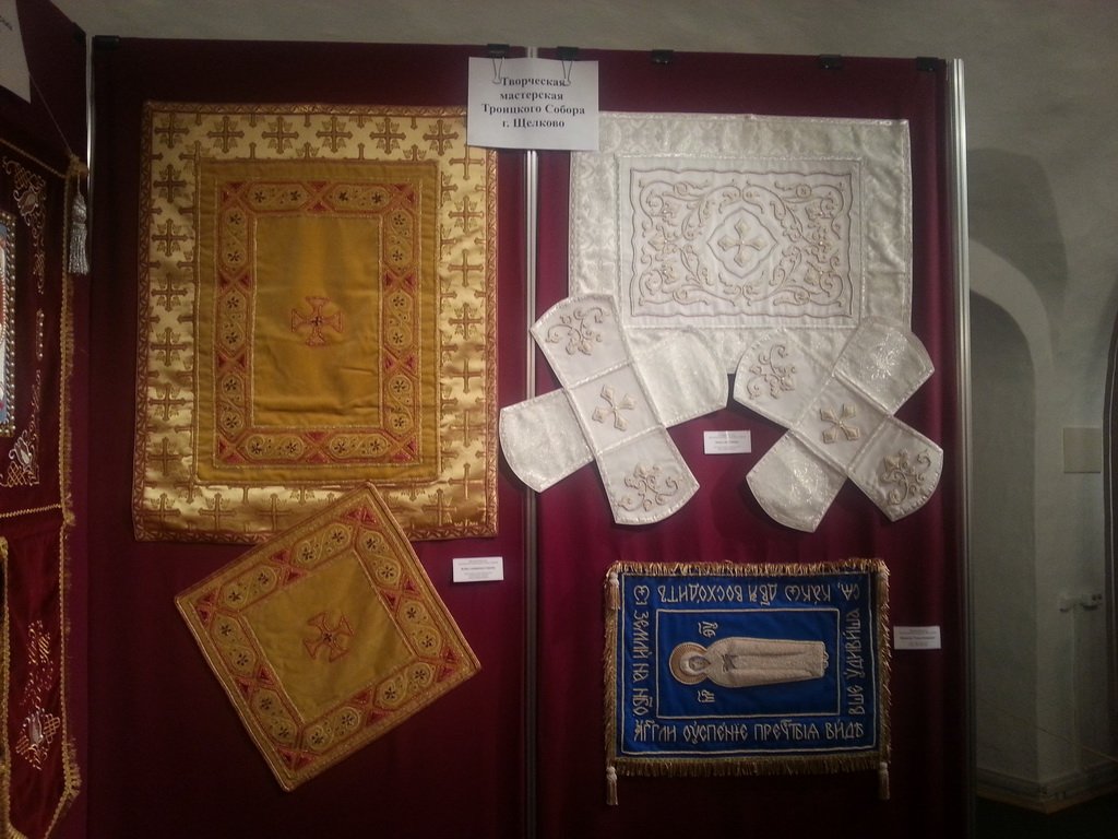 Творческую мастерскую Троицкого собора г. Щелкова представляла золотошвея Наталья Хаджина. Она привезла в Москву свои работы — воздух и два покровца (белый бархат, жемчуг, серебряные шнуры), квадратный покровец и воздух (желтый бархат, гранат, жесткая канитель, аппликация), а также уникальную работу — Плащаницу «Успения Богоматери», выполненную в старинной технике сажения по бели, когда жемчуг вышивается по белому настилу вместе с крученым золотым шнуром.