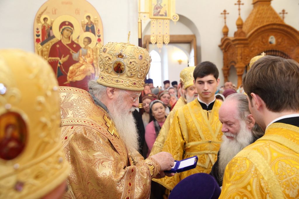 За малым входом владыка Ювеналий вручил церковные награды клирикам Московской епархии, особо потрудившимся в деле развития церковной жизни в епархии. Наперсным крестом был награжден настоятель