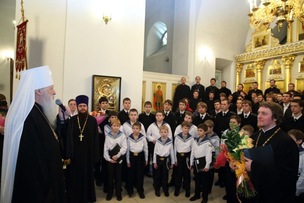 «Нам сегодня здесь так хорошо, как на Фаворе! Не хочется уходить отсюда. Я благодарю вас за то, что вы были сегодня с нами. То, что вы слышали — это наследие, которое мы храним от начала времен христианства, принесенного нам на землю Крестителем Руси — святым равноапостольным князем Владимиром. И мы радуемся, что обладаем этим богатством, которое дает нам и силу, и любовь, и веру. И я хотел бы со своей стороны поблагодарить наших высоких гостей за то, что они прибыли на наш праздник. С особым чувством я благодарю этих замечательных людей, которые жертвенно сегодня показывали свое искусство и свою любовь к Богу и ближним. Это сегодня благотворительный концерт. Мы ничем не можем вознаградить певцов, но наши заключительные аплодисменты будут выражением глубокой сердечной любви к ним. И мы прощаемся с вами до новых встреч!».