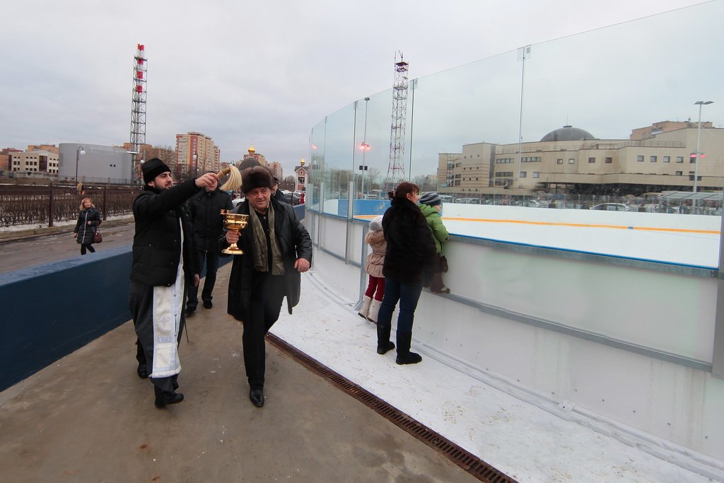 Клирик Серафимо-Саровской церкви г. Щелкова священник Виталий Крикота совершил молитву на начало благого дела, окропив каток святой водой.