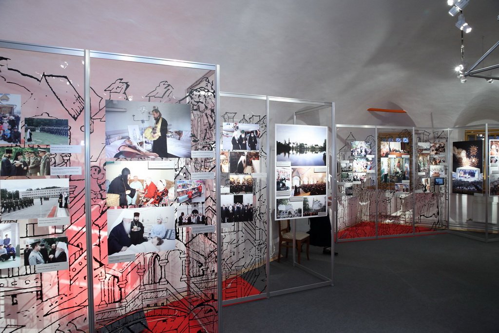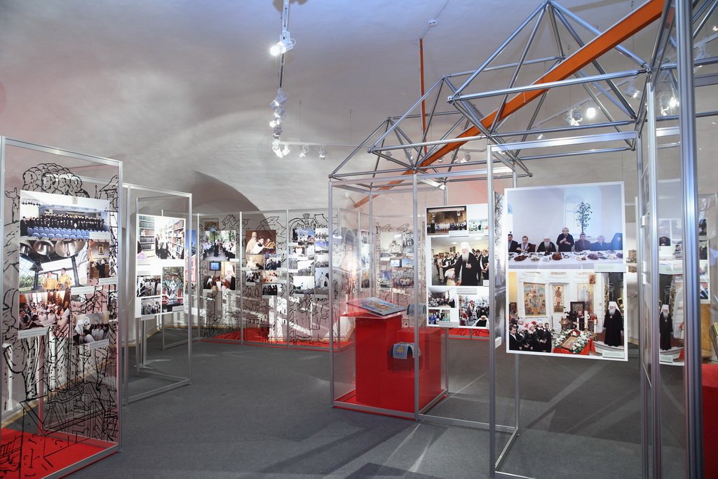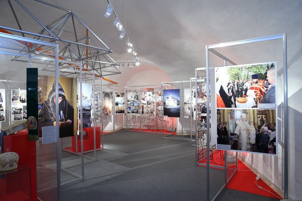 С приветственным словом к присутствующим обратился Владыка Ювеналий: «Возлюбленные братья архипастыри, дорогая мать игуменья, наши дорогие высокие гости! Я очень рад всех вас приветствовать и благодарю за ваше внимание к нашему очередному мероприятию Московской епархии в Новодевичьем монастыре в нашем церковном музее. Сначала хотел бы сказать о церковном музее. Здесь раньше находился филиал Государственного Исторического музея. Когда он покинул стены Новодевичьего монастыря, мы в тот же день создали церковный музей. Я думаю, многие на него смотрели с улыбкой и недоверием. Что могут сделать в монастыре? Какой церковный музей могут представить? Но опыт показал, что интерес к монастырю и музею не ослаб до сегодняшнего дня. Это нас ко многому обязывает и я хотел бы объяснить наименование нашей выставки „Московская епархия вчера и сегодня“. Это символическое название. Мы не говорим о Московской епархии от времен ее создания, потому что такую задачу нам не охватить. Мы говорим о вчерашнем дне, когда в прошлом веке мы были свидетелями трагических событий в жизни Русской Православной Церкви, включая нашу Московскую епархию. Совсем недавно, несколько лет тому назад, началось духовное возрождение Русской Православной Церкви и, в том числе, Московской епархии. Наша выставка сосредоточена на этих двух событиях: трагическом и радостном, разрушении и созидании. В этом зале, где мы сейчас встречаемся, все напоминает о трагической истории нашей Московской епархии, когда и сама Церковь была приговорена к полному тотальному уничтожению. Мы