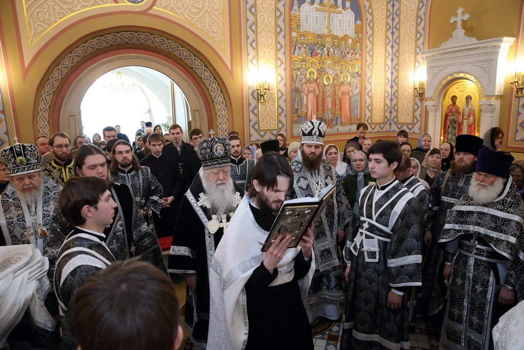 Я поздравляю всех вас с началом Великого поста. Сегодня в первом же песнопении на „Господи воззвах“ в стихире говорилось: „Постяся, братие, телесне, постимся и духовно“, и разъясняется, в чем же заключается подлинный пост. Некоторые стараются в деталях исполнить все предписания устава и на это у них уходят все силы духа и воли, и когда они не вкушают скоромного, считают, что они уже спасены в очах Божиих. А вот апостол Павел в одном из своих посланий разъясняет: „Пища не приближает нас к Богу: ибо, едим ли мы, ничего не приобретаем; не едим ли, ничего не теряем“ (1Кор. 8, 8). Так в чем же смысл поста? А он, возлюбленные, заключается в том, чтобы помочь обуздать свою греховную плоть и дать помощь нашему духу встать во главе, начать духовную жизнь, борясь со своими грехами, страстями, похотью своей, и пост — это лишь средство, которое помогает нам это сделать. Может ли человек этим заниматься, когда пребывает в переедании, в пьянстве, в разгуле? Это ведь и есть грех. Этого надо избегать, бороться, освобождаться. И я думаю, что все мы это знаем, но порой только обращаем внимание на то, как бы не оскоромиться, как бы чего случайно не съесть скоромного, но мы должны бояться не повторить греха. Мы готовимся к исповеди перед принятием Святых Христовых Таин и во время исповеди открываем свою совесть, душу свою раскрываем перед духовником, но это делаем для того, чтобы получив прощение, никогда не возвращаться к прежнему греху. Мы знаем, что человек слаб и не удерживается от того, чтобы порой не повторить свой грех, поэтому Церковь установила ежегодные посты, когда особенно призывает своих чад „прийти в себя“ и подумать о спасении своей грешной души.
