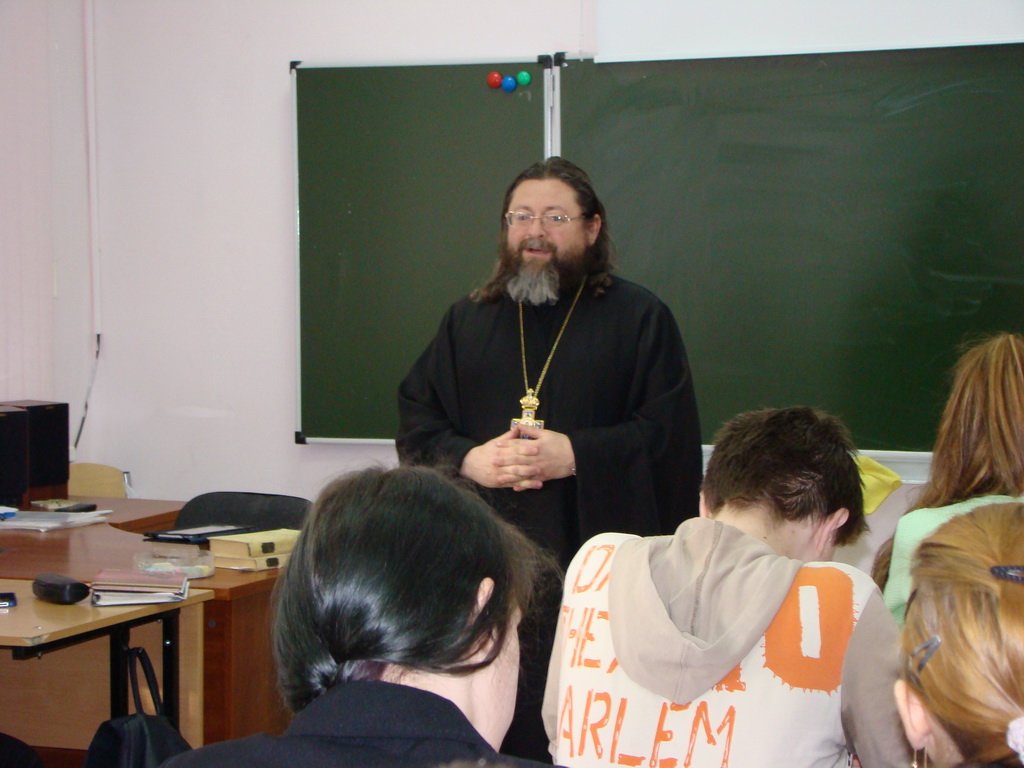 Необычный урок прошел 21 марта в Ломоносовском лицее информационно-технологического профиля с углубленным изучением английского языка г. Ногинска. Его провел не учитель, а священник — настоятель Иоанно-Предтеченского храма в селе Ивановское протоиерей Игорь Гагарин. Встреча батюшки с лицеистами была посвящена творчеству Федора Михайловича Достоевского и проходила в рамках мероприятий, приуроченных к Дню православной книги.