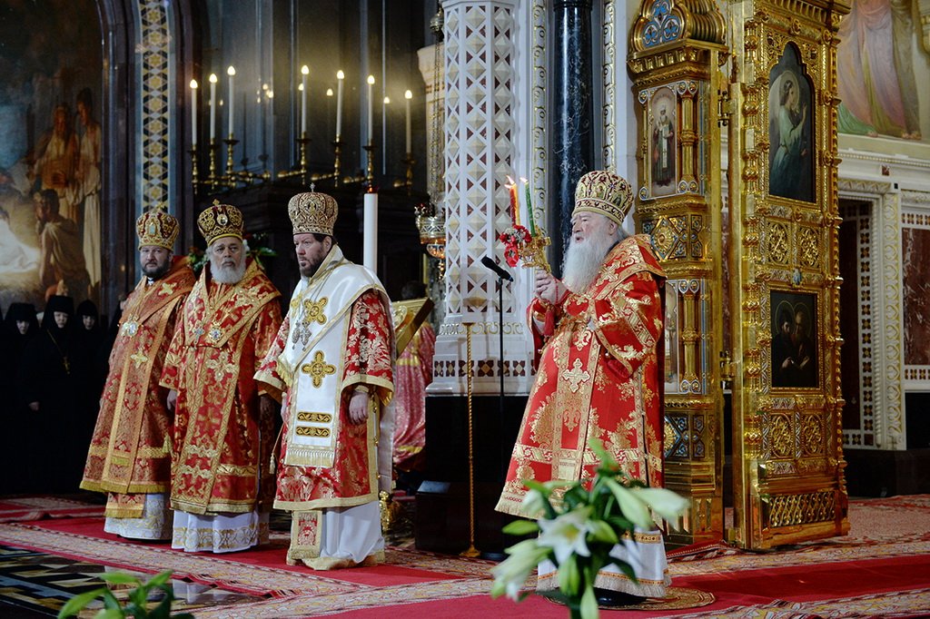 По окончании Пасхальной вечерни митрополит Ювеналий от лица Священного Синода, всей полноты Русской Православной Церкви, представительств Поместных Православных Церквей поздравил Святейшего Патриарха Кирилла со Светлым праздником Пасхи: