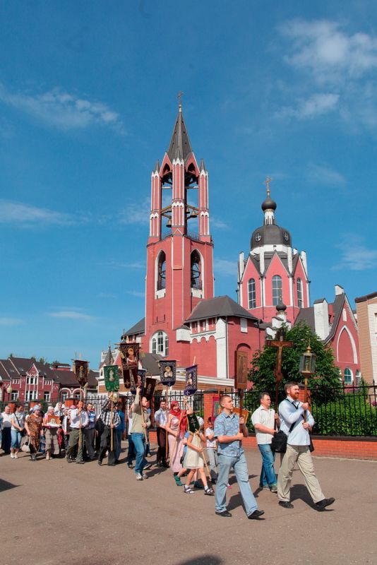 В 15 часов участники крестного хода собрались в храме Покрова Божией Матери. В 1933–1937 годах в этом храме служил настоятелем священномученик Александр Крутицкий, один из первых прославленных в лике святых новомучеников Щелковской земли. Многие прихожане Покровского храма держали в руках образы свщмч. Александра Крутицкого, Господа Вседержителя, Щелковских новомучеников, святителя Николая Чудотворца, царственных страстотерпцев, большие храмовые иконы — икону царя Николая и икону Воскресения Христова.