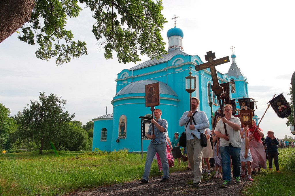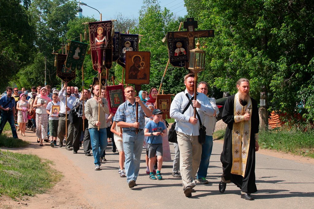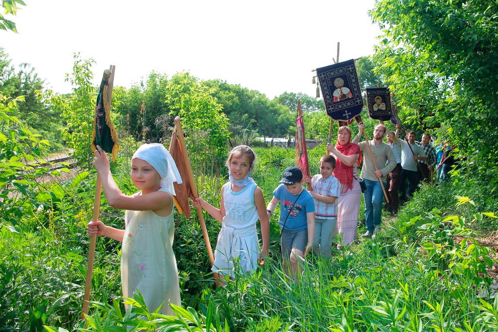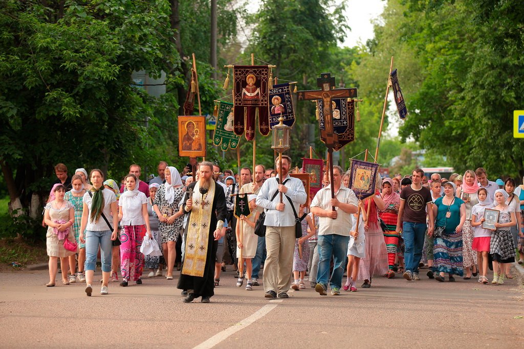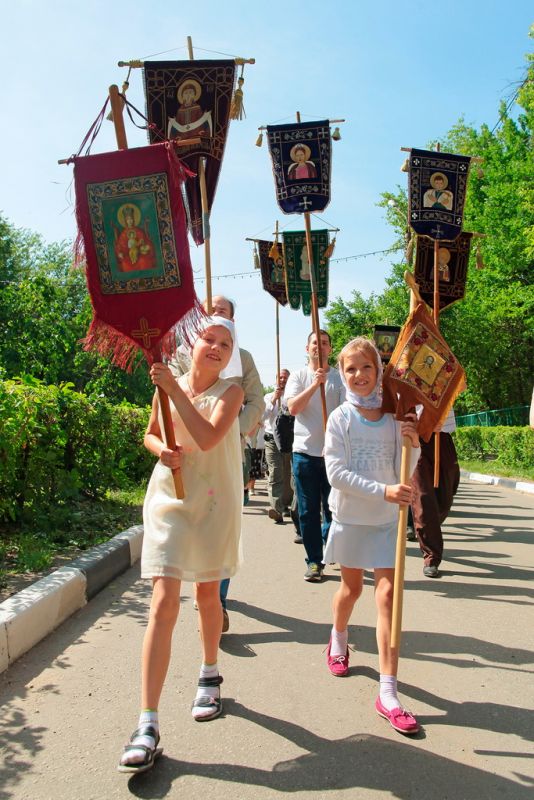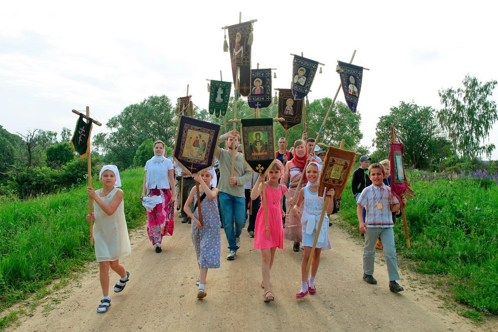 Вынесли хоругви, и крестный ход тронулся в путь. Среди участников крестного хода много детей. Для них — специальные маленькие хоругви. Впереди девятикилометровый маршрут с остановками в Троицком соборе г. Щелково, Знаменской церкви в с. Амерево и в конечной точке — храме