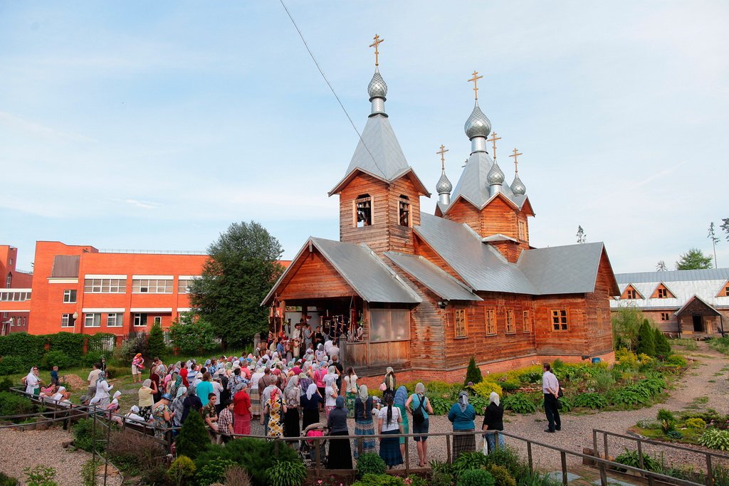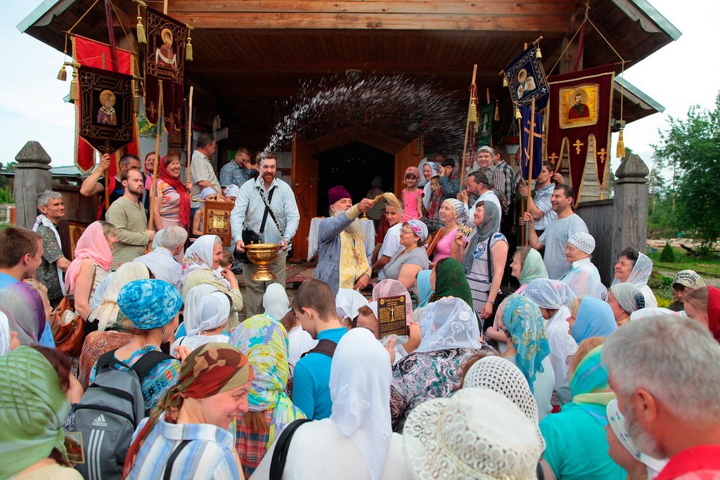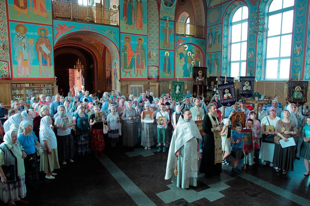 В Троицком соборе паломников встречают готовые присоединиться к крестному ходу прихожане во главе с ключарем собора протоиереем Димитрием Кузнецовым. Собор посвящен рождению цесаревича Алексия, построен и освящен еще при жизни святого в 1916 году.