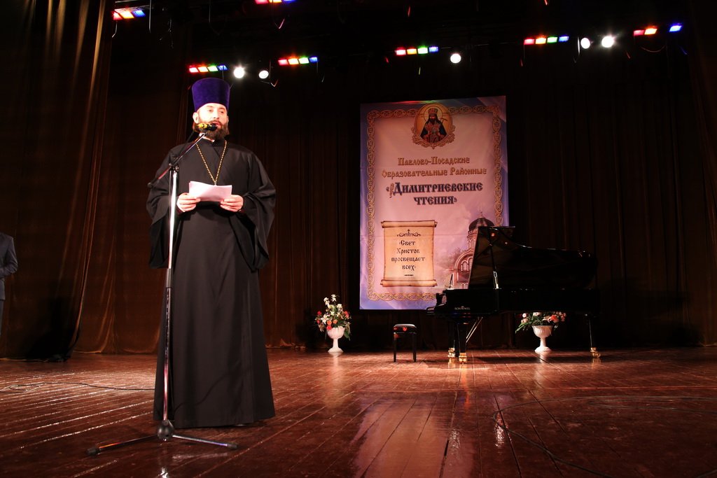 10 ноября в Павлово-Посадском благочинии состоялись Дмитриевские чтения, посвященные святителю Димитрию Ростовскому, организуемые приходом Вознесенского храма г. Павловский Посад. В храме Вознесения Господня, один из приделов которого освящен в честь святителя Димитрия, была совершена праздничная Божественная литургия, которую возглавил настоятель храма священник Марк Ермолаев. Для участия в чтениях, посвященных 100-летию Первой мировой войны, во дворец культуры «Павлово-Покровский» собрались священнослужители, представители районных и городских властей, педагоги, предприниматели, учащиеся учебных заведений района. Чтения открылись выступлением хореографического коллектива «Славянка» и сводного хора храма Вознесения Господня. Со словами приветствия к собравшимся обратились благочинный Павлово-Посадского церковного округа протоиерей Александр Хомяк и заместитель руководителя администрации Павлово-Посадского муниципального района С. Ю. Аргунова. Просветительская часть Димитриевских чтений была представлена докладами «Русский Крест: духовно-нравственное значение Первой мировой войны» клирика Никольского храма села Васютино священника Иоанна Шумилова и «Первая мировая война в русской поэзии и прозе» преподавателя лицея № 2 г. Павловского Посада О. И. Конаковой. В праздничном концерте принял участие Хор духовенства Московской епархии под руководством священника Сергия Голева.