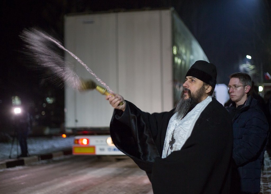 14 декабря из Ногинского спасательного центра МЧС России отправилась очередная автомобильная колонна МЧС с грузом гуманитарной помощи для жителей Донецкой и Луганской областей. В проводах колонны принял участие председатель Епархиального отдела по взаимодействию с Вооруженными силами и правоохранительными учреждениями, благочинный Богородского округа протоиерей Михаил Ялов и заместитель руководителя администрации Ногинского района В. Виноградов. Отец Михаил вручил заместителю начальника Ногинского спасательного центра МЧС России полковнику Ю. Шмыреву икону вмч. Георгия Победоносца и благословил участников поездки.