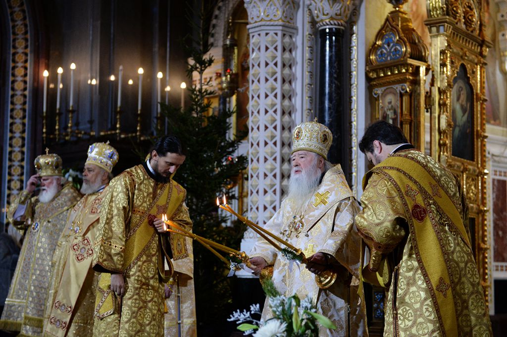 По окончании богослужения от имени всей полноты Русской Православной Церкви Святейшего Патриарха Кирилла с праздником Рождества Христова поздравил митрополит Ювеналий: