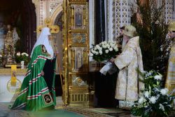 Предстоятелю Русской Православной Церкви также сослужили руководители синодальных учреждений, настоятели ставропигиальных мужских монастырей, духовенство г. Москвы и Московской области.