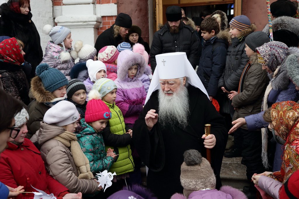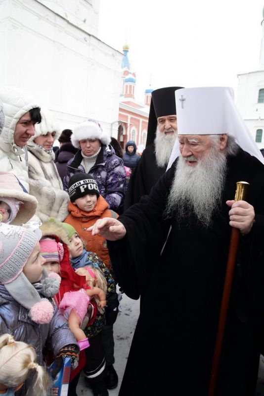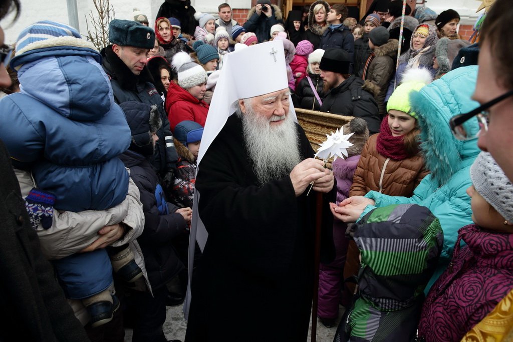 При выходе из храма юные прихожане коломенских храмов поздравили Владыку Ювеналия, а он, в свою очередь, благословил маленьких христославов и преподнес им в подарок большой сундук, наполненный конфетами. После этого дети и взрослые с сияющими звездами и бумажными ангелами в руках, прошли от Соборной площади до храма Архангела Михаила, прославляя пришедшего в мир Спасителя праздничными колядками. В этот же день артисты театра «Пилигрим» представили Рождественское вертепное действо «Смерть царя Ирода», после которого около пятисот ребят, среди которых были беженцы с Украины и дети из многодетных семей, получили рождественские подарки.