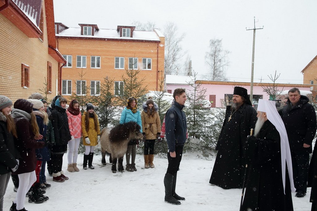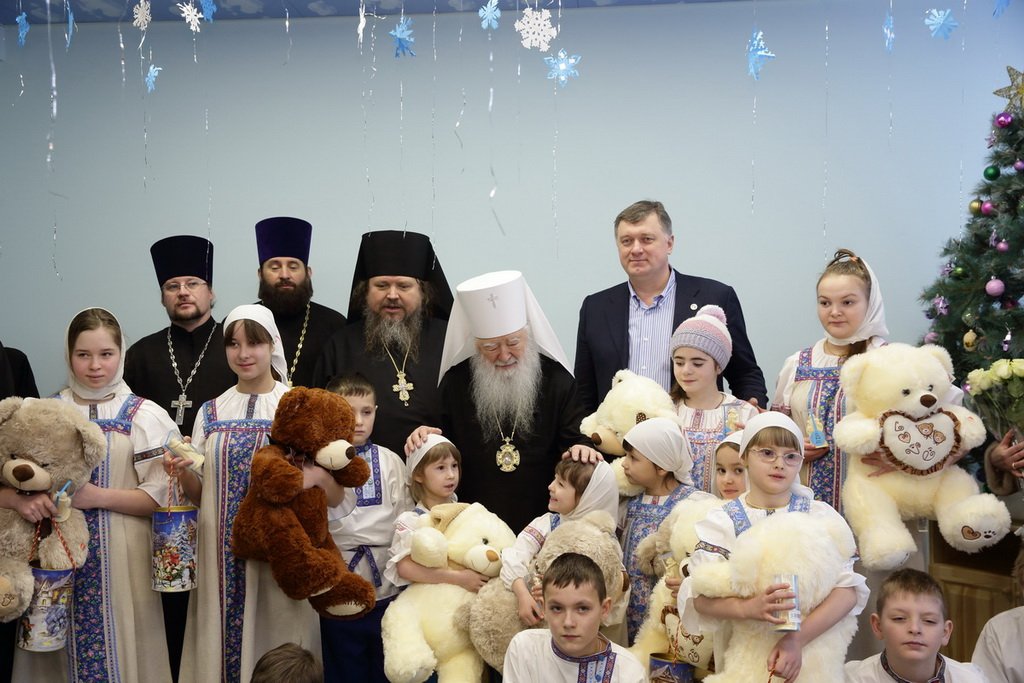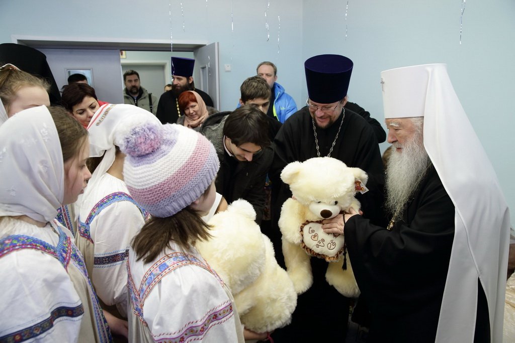 Владыка митрополит пообщался с детьми и вручил им игрушки и сладости, а также картину Павла Рыженко «Победа Пересвета». Игумен Амвросий в ответном слове поблагодарил Владыку за подарки и внимание, а также преподнес ему икону Божией Матери и подарки, сделанные руками воспитанников Детского корпуса и учащимися воскресной школы.