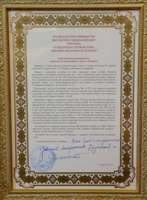 Митрополит Ювеналий поздравил Владыку Григория с 75-летием: «Через несколько дней, 1 января, Владыке Григорию исполнится 75 лет. Он, конечно, будет где-то в затворе, никто его не увидит и не услышит, наверное, и к телефону не подойдет, а каждый будет иметь потребность его поздравить. Поэтому я принял решение досрочно, надеюсь Господь услышит наши молитвы, от вашего и от своего имени уже сегодня поздравить Владыку Григория с наступающим юбилеем. В первую очередь хочу огласить приветственный адрес, который я подготовил».