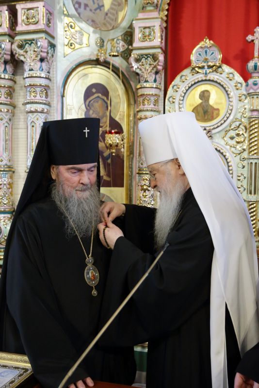 Владыка митрополит вручил архиепископу Григорию медаль Московской епархии «За жертвенные труды» I степени и панагию. Патриаршие награды были вручены: делопроизводителю Московского епархиального управления Е.В. Неровновой – орден преподобной Евфросинии, великой княгини Московской, III степени, клирику храма мученика Уара Египетского поселка Вешки Мытищинского района протодиакону Павлу Трошинкину и руководителю общины глухих «Денница» при храме святителя Тихона, Патриарха Всероссийского, города Клина Д.Е. Балашову – Патриаршие грамоты.