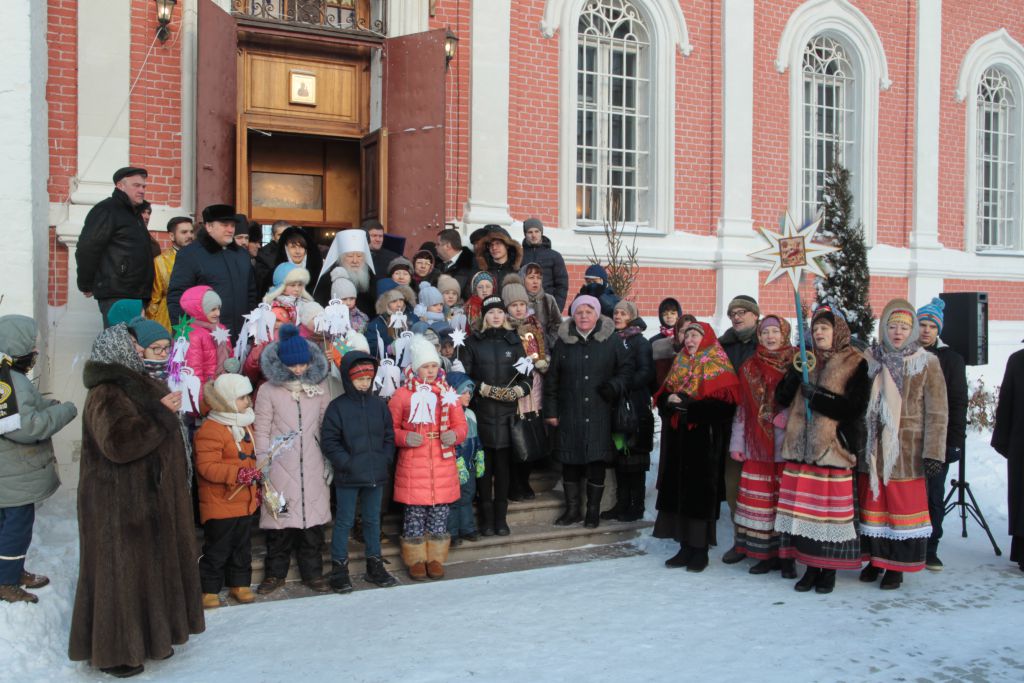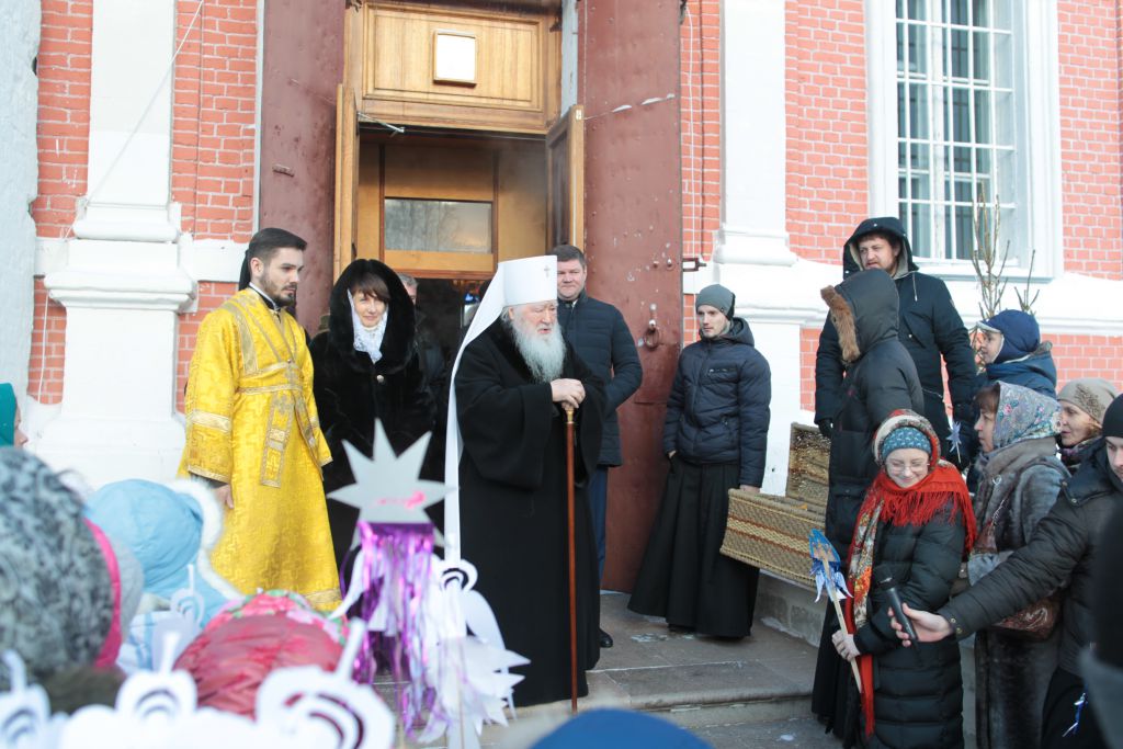 У выхода из храма юные прихожане коломенских храмов исполнили для Владыки митрополита праздничные песнопения, а он поприветствовал детей с Рождеством Христовым и Новолетием и подарил им конфеты.