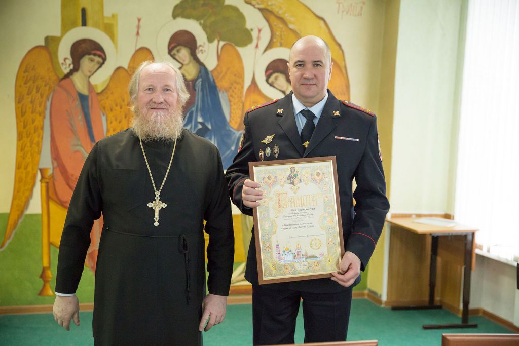 Отец благочинный вручил благодарственные и благословенные грамоты митрополита Ювеналия военнослужащим и сотрудникам правоохранительных органов, отличившимся в укреплении взаимного сотрудничества. С докладом «Военное духовенство Русской Православной Церкви в начале XX века» выступил ответственный за взаимодействие с Вооруженными силами и правоохранительными учреждениями, настоятель Богородицерождественского храма села Образцово священник Димитрий Выдумкин. Отец Димитрий подвел итоги проделанной работы за прошедший год и предложил дальнейший план взаимодействия. Каждый участник встречи получил в подарок книгу