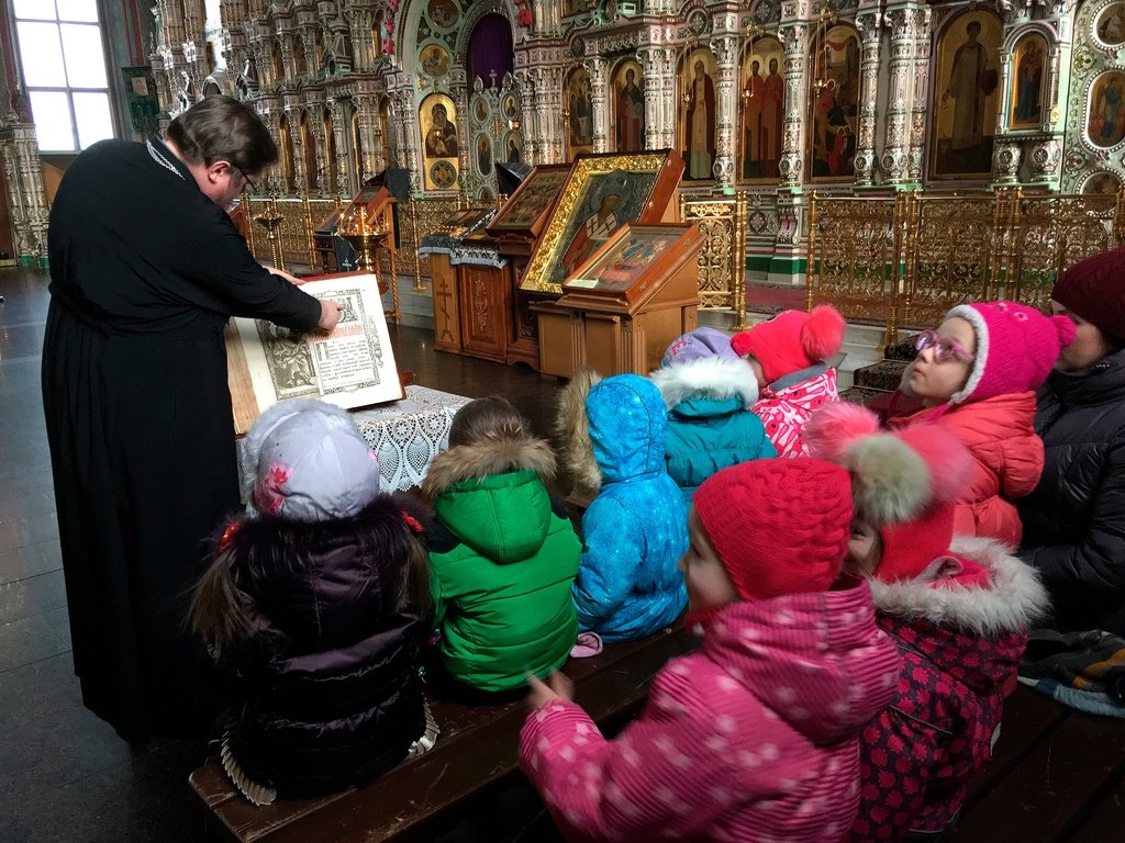 28 апреля в Троицком соборе г. Щелково прошла экскурсия для воспитанников детского сада № 57 «Светлячок». Священник Александр Амелин рассказал об устройстве храма и иконостаса, а также показал ребятам старинное Евангелие 1735 года.