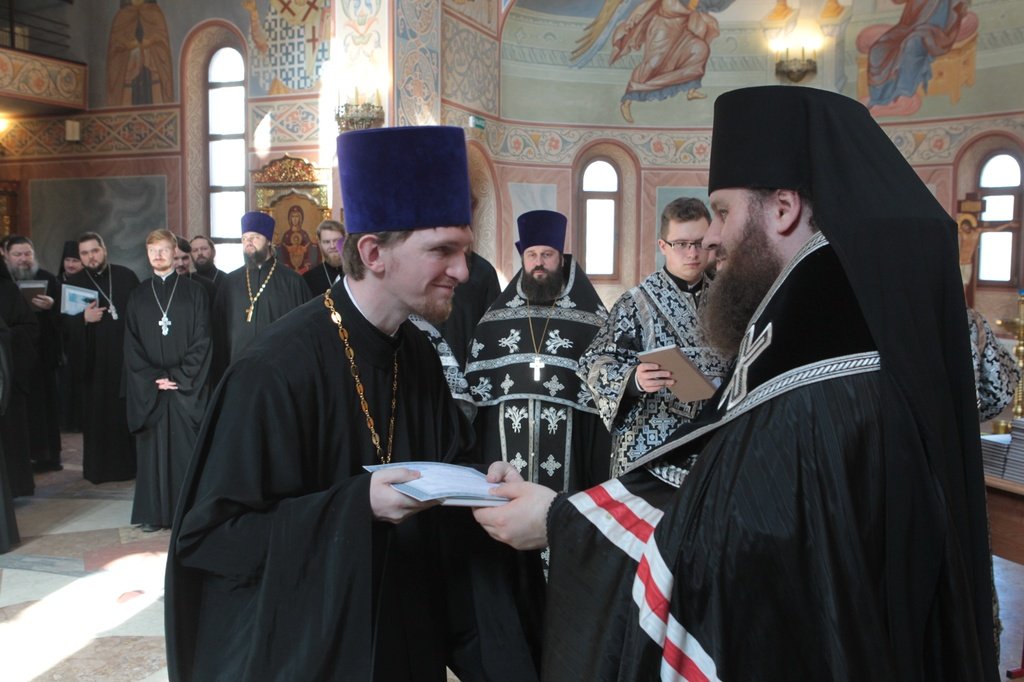 Затем епископ Константин совершил благодарственный молебен по случаю окончания сессии курсов и вручил духовенству удостоверения о повышении квалификации. Протоиерей Максим Максимов вручил каждому слушателю новую книгу архимандрита Дамаскина (Орловского) «Человек – это его совесть. Житие священномученика Евгения (Зернова), митрополита Нижегородского и Арзамасского». От лица слушателей курсов благодарственное слово произнес благочинный церквей Люберецкого округа священник Вячеслав Новак. В дар Коломенской духовной семинарии от духовенства Балашихинского и Люберецкого благочиний был передан образ «Воскрешение Лазаря».