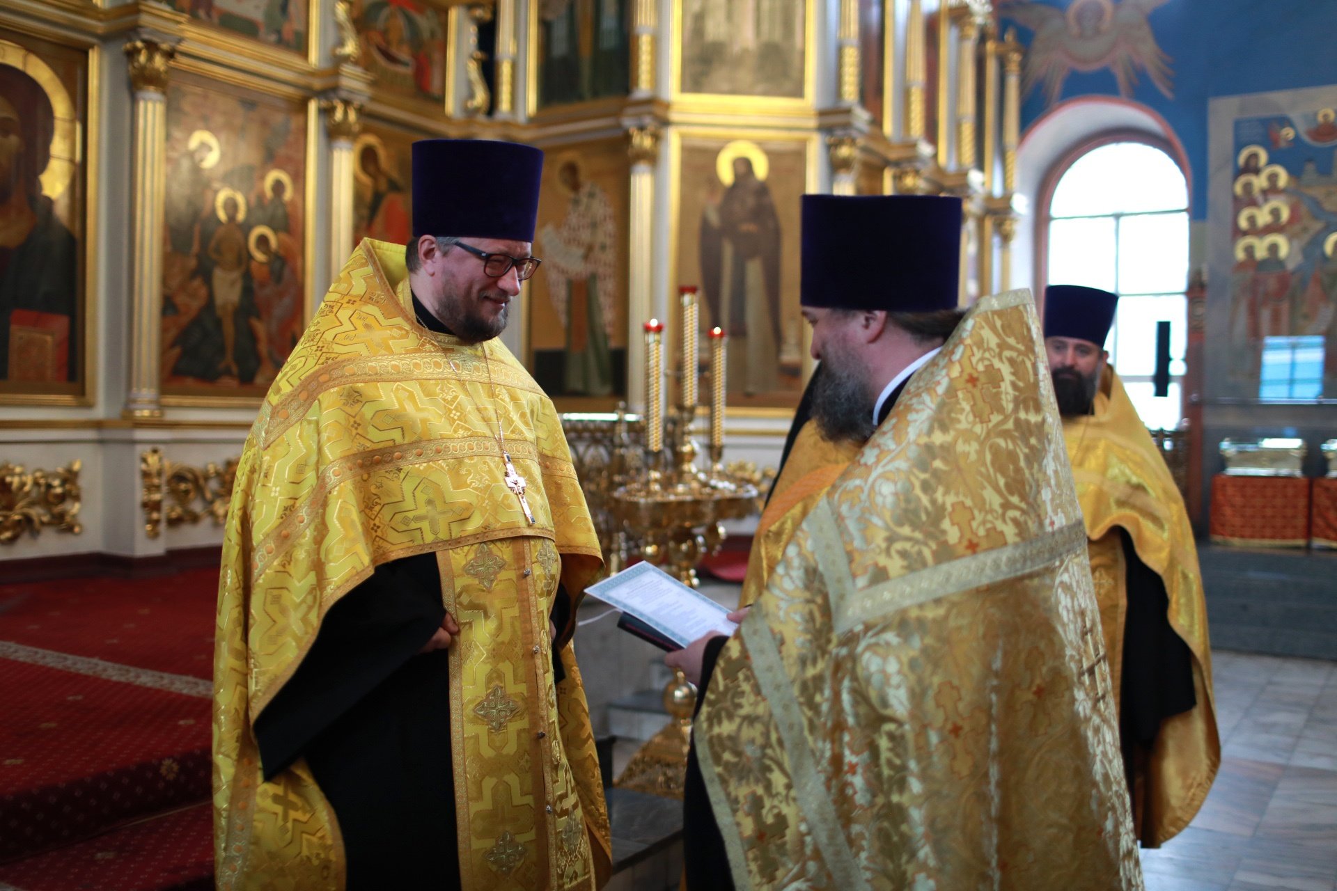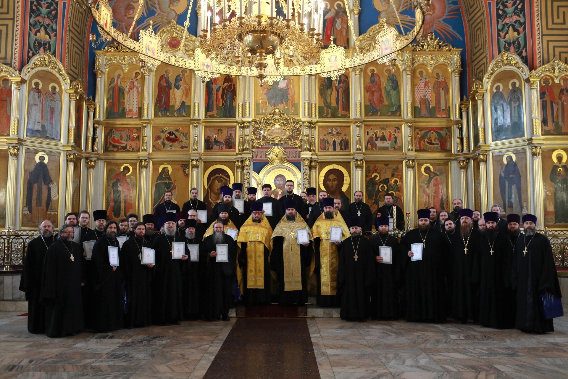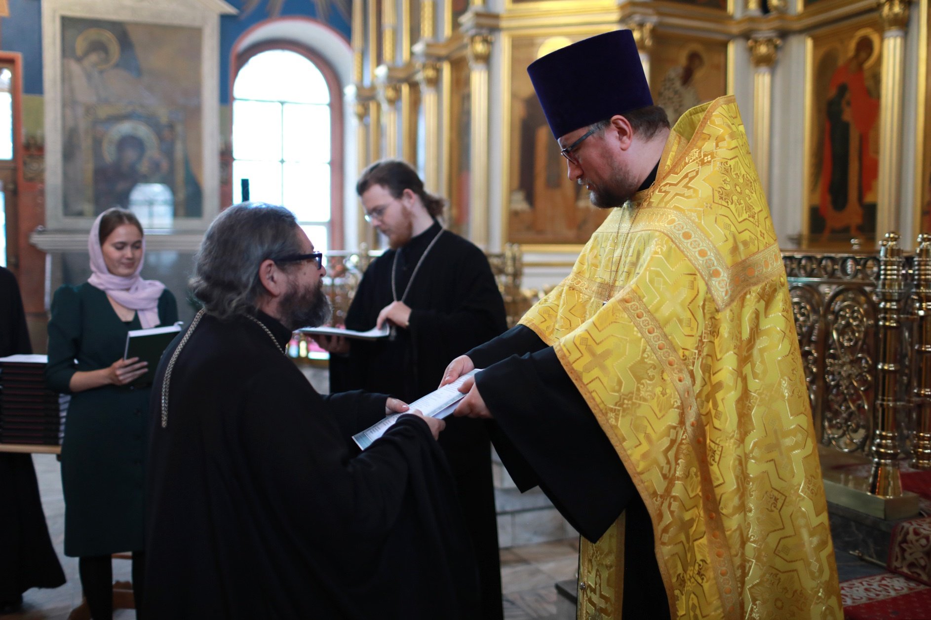 6 ноября в Богоявленском соборе г. Ногинска состоялось вручение дипломов священнослужителям Московской епархии, прошедшим обучение на курсах повышения квалификации. Перед церемонией вручения заведующий курсами протоиерей Максим Максимов в сослужении духовенства совершил благодарственный молебен и обратился к выпускникам с напутственным словом. Благочинный церквей Богородского округа протоиерей Марк Ермолаев поблагодарил протоиерея Максима Максимова за руководство курсами и передал ему образ Христа Спасителя. Каждому из выпускников, помимо диплома, был вручен трехтомный сборник трудов священномученика Митрофана, епископа Астраханского.