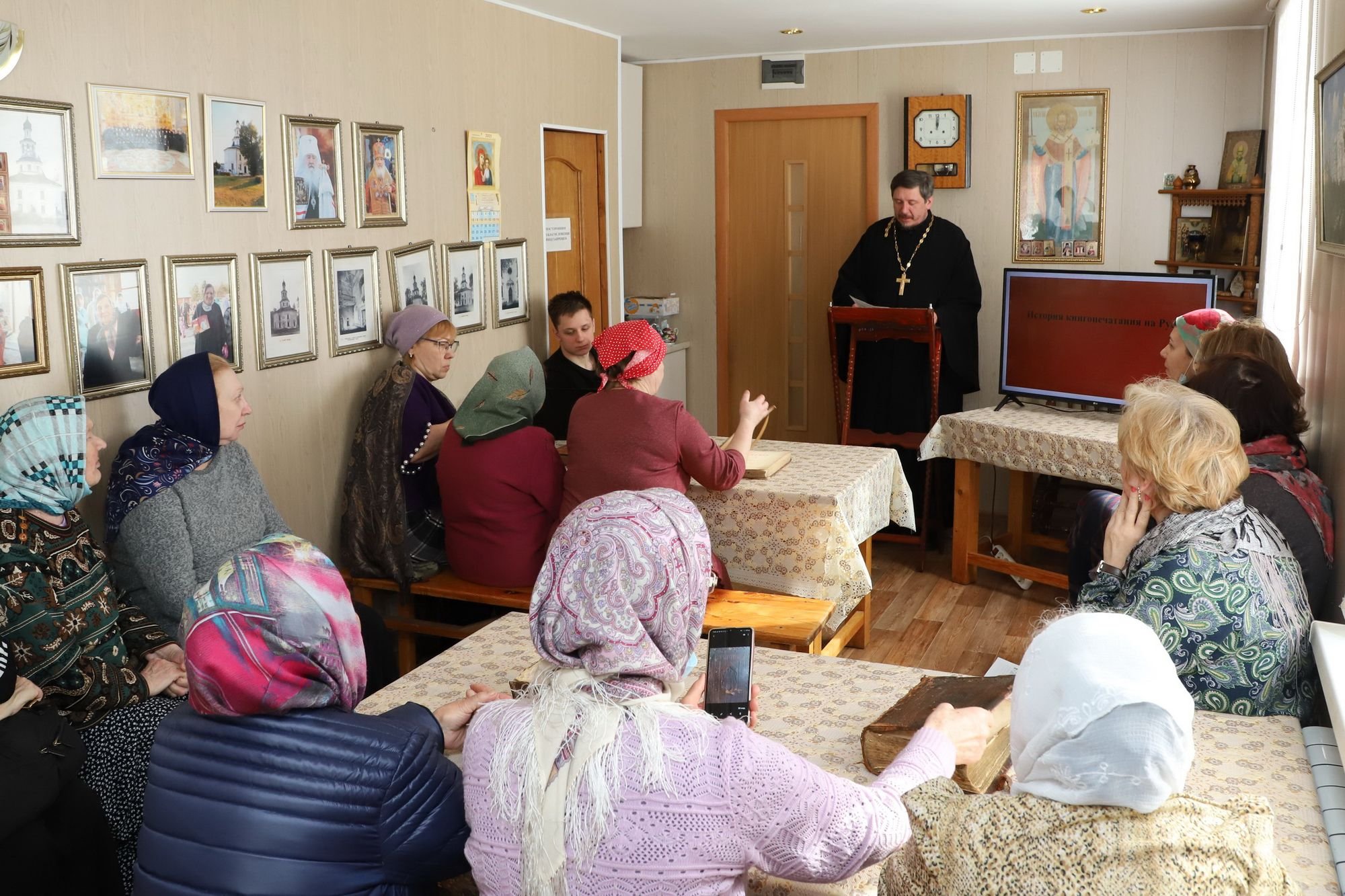 28 марта в библиотеке Никольского храма деревни Полтево прошел День открытых дверей. Настоятель храма священник Иоанн Обрембальский выступил с докладом на тему «Печатные книги на Руси» и рассказал об истории книгопечатания.