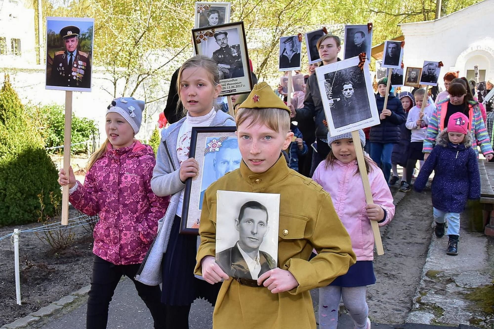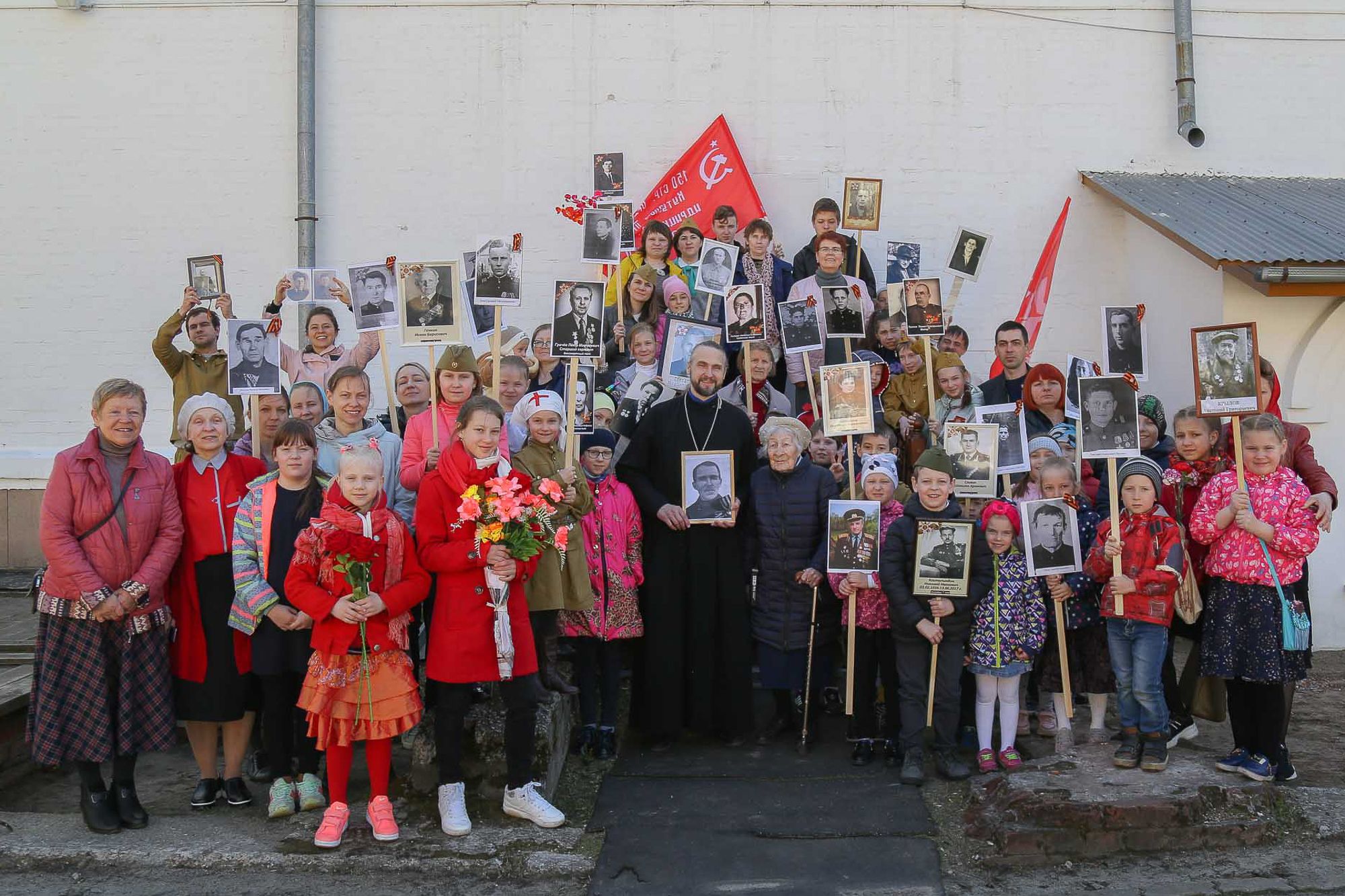 9 мая в воскресной школе Тихвинского храма г. Ногинска прошла семейная акция «Наш бессмертный полк». Состоялась церемония возложения цветов к расположенному на территории храма обелиску. Прихожане принесли фотографии своих родных, воевавших за Отечество. Затем в актовом зале школы состоялся фестиваль поэзии «Этот День Победы». Начался он минутой молчания и просмотром документальной хроники тех лет.