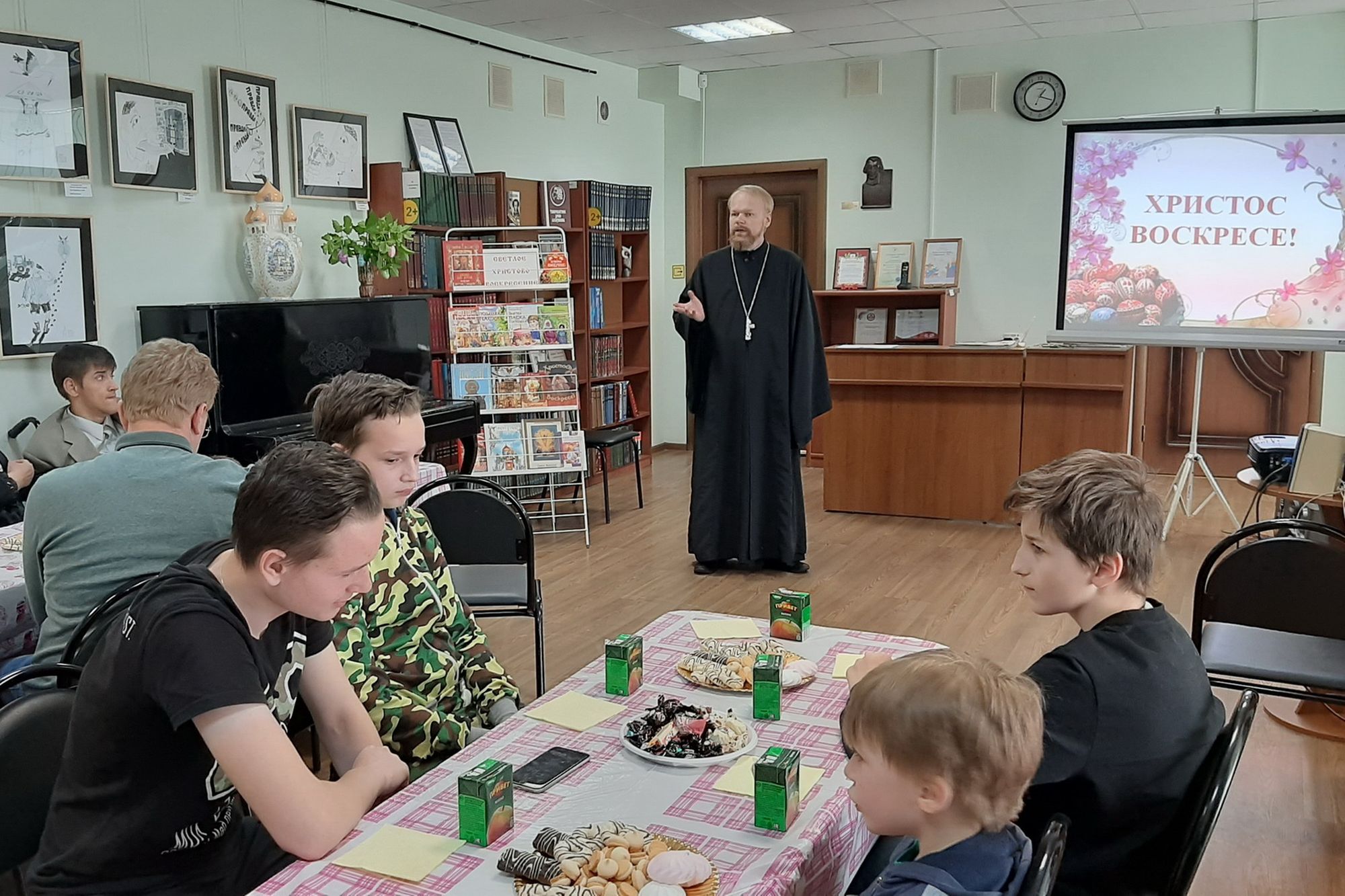 На встрече присутствовал клирик Троицкого собора г. Щелково священник Димитрий Медведев, который рассказал о празднике Воскресения Христова.