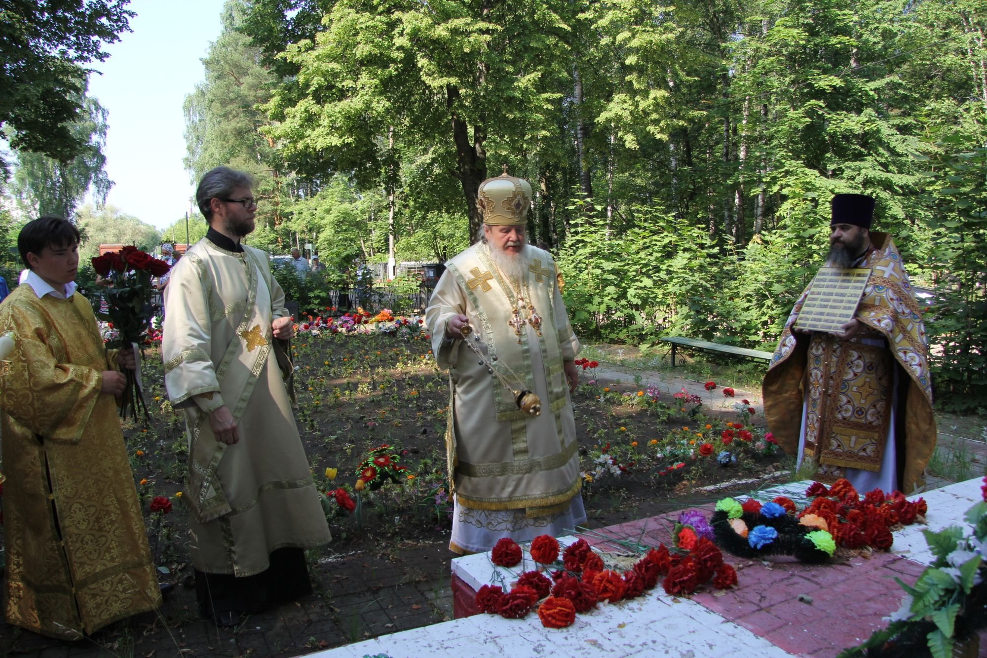 Во время крестного хода епископ Николай совершил заупокойную молитву по погибшим в годы Великой Отечественной войны и возложил цветы к памятнику, находящемуся на территории кладбища.