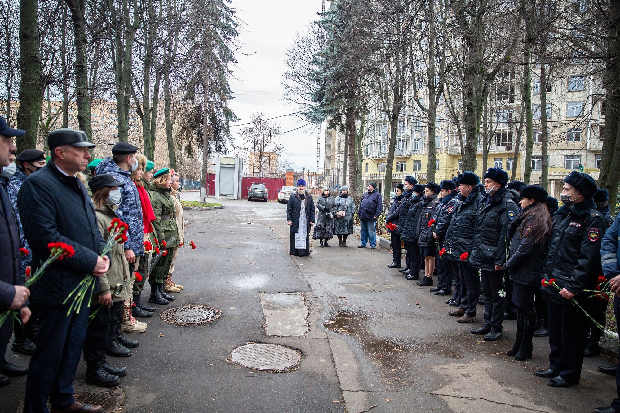 У главного здания управления Министерства внутренних дел Российской Федерации «Щелковское» собрались личный состав и ветераны межмуниципального управления МВД России «Щёлковское», члены семей сотрудников, погибших при исполнении служебных обязанностей, заместитель главы администрации городского округа Щёлково по территориальной безопасности Виктор Семин, благочинный церквей Щёлковского округа протоиерей Андрей Ковальчук, представители Щёлковского отделения Всероссийского детско-юношеского военно-патриотического движения «Юнармия».