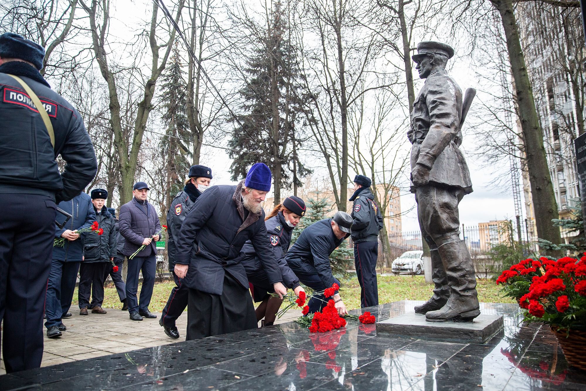 Отец Андрей совершил панихиду у Мемориала погибшим при исполнении служебных обязанностей сотрудников Щёлковского управления МВД, после чего к памятнику возложили цветы.