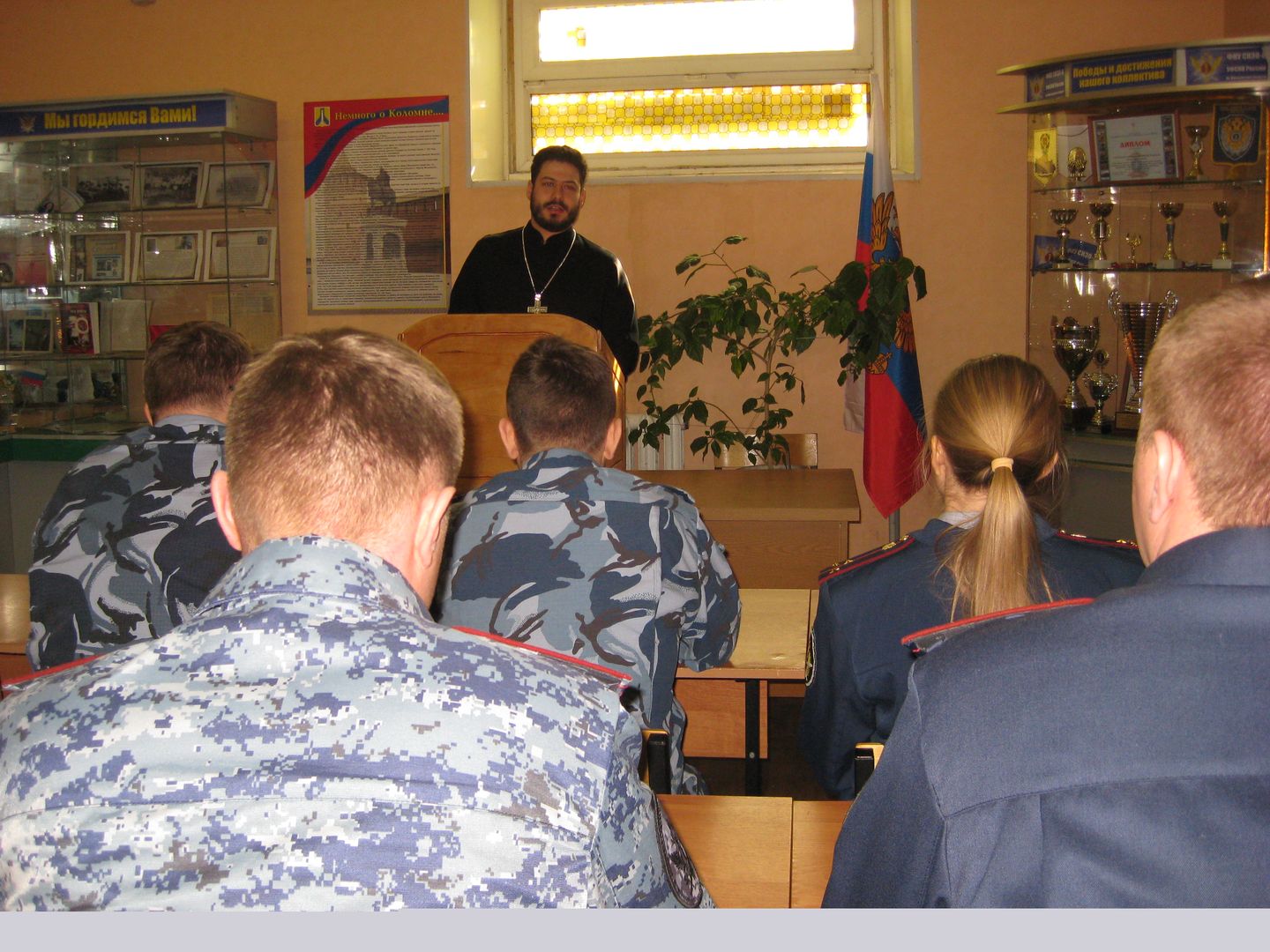 На следующий день, 31 марта, иерей Александр Державич совершил молебен «О сотрудниках уголовно-исполнительной системы» в исправительной колонии № 6 г. Коломны. По окончании молитвы отец Александр провел беседу с личным составом учреждения о подготовке к важнейшему христианскому празднику – Светлому Христову Воскресению.