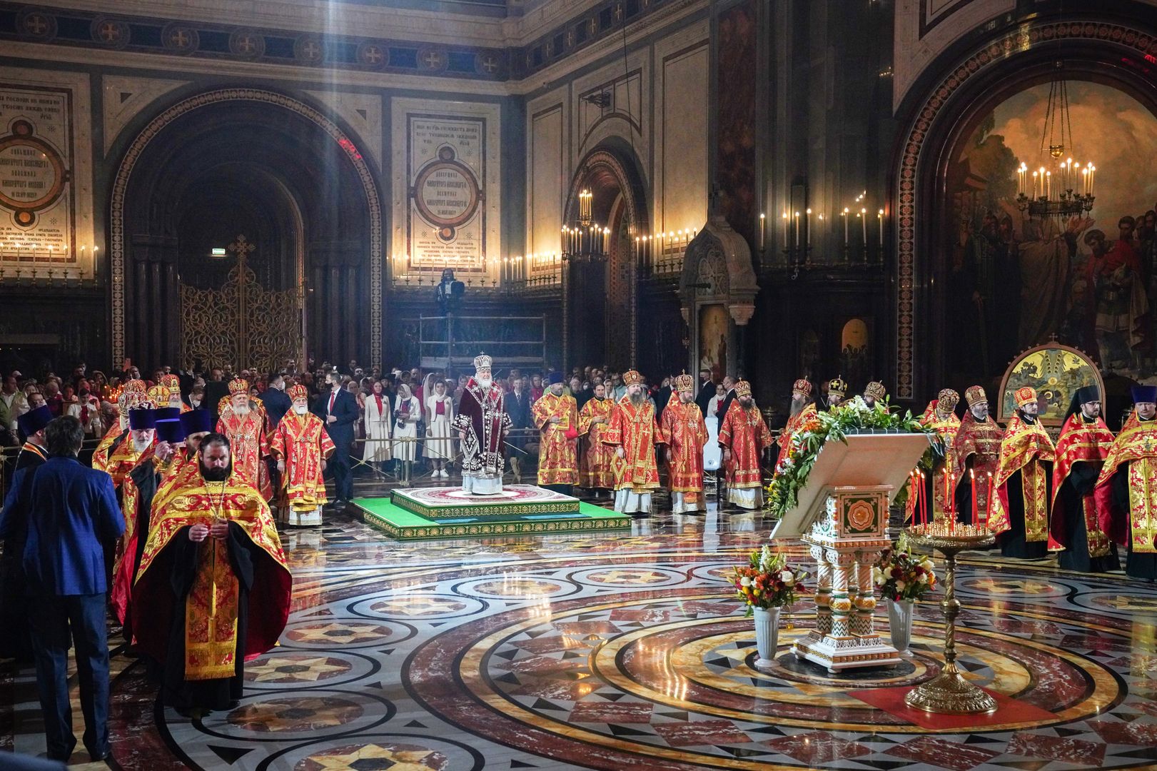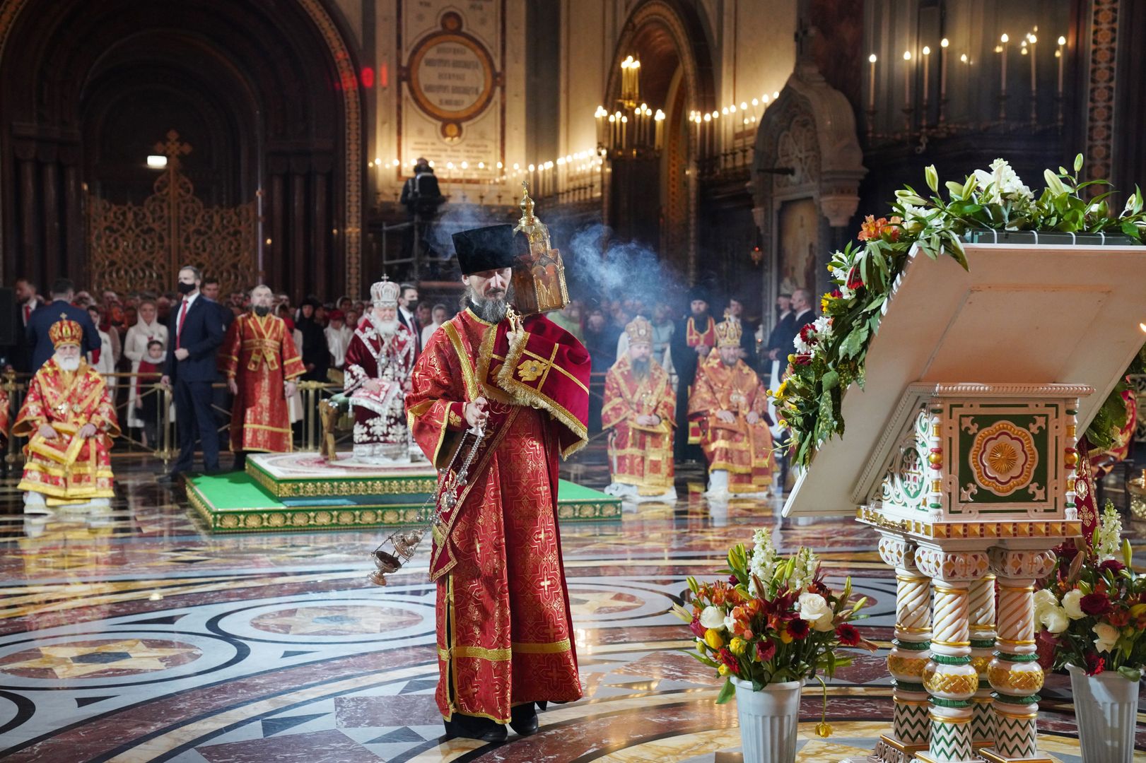 «Ваше Святейшество, Святейший Владыка и милостивый отец! В этот Пасхальный вечер благословите поздравить с Пасхой Христовой от всей полноты Русской Православной Церкви — от имени епископата, священнослужителей, верующих людей и всех, кто собрался в этом замечательном кафедральном соборе Христа Спасителя. Приветствуем Вас словами Пасхальной радости: Христос Воскресе!