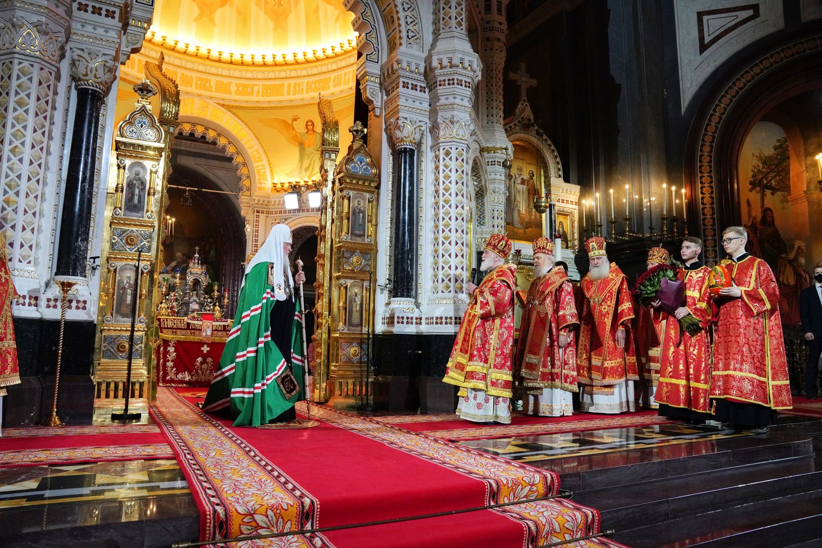 Его Святейшеству сослужили: митрополит Крутицкий и Коломенский Павел, Патриарший наместник Московской митрополии; митрополит Воскресенский Дионисий, управляющий делами Московской Патриархии, первый викарий Патриарха Московского и всея Руси по г. Москве; митрополит Каширский Феогност, председатель Синодального отдела по монастырям и монашеству; архиепископ Егорьевский Матфей; архиепископ Подольский и Люберецкий Аксий, секретарь Архиерейского совета Московской митрополии; епископ Павлово-Посадский Силуан, заместитель управляющего делами Московской Патриархии; епископ Сурожский Матфей; епископ Одинцовский и Красногорский Фома, руководитель Административного секретариата Московской Патриархии; епископ Сергиево-Посадский и Дмитровский Фома, наместник Свято-Троицкой Сергиевой лавры; епископ Зеленоградский Савва, заместитель управляющего делами Московской Патриархии; протопресвитер Владимир Диваков, секретарь Патриарха Московского и всея Руси по г. Москве; протоиерей Михаил Рязанцев, ключарь Храма Христа Спасителя; протоиерей Николай Балашов, заместитель председателя Отдела внешних церковных связей Московского Патриархата; архимандрит Алексий (Туриков), личный секретарь Святейшего Патриарха Кирилла; протоиерей Игорь Якимчук, секретарь ОВЦС по межправославным отношениям; иерей Дионисий Казанцев, секретарь Святейшего Патриарха по Московской митрополии; иеромонах Ермоген (Бурыгин), и.о. председателя Финансово-хозяйственного управления Московского Патриархата; московское духовенство.
