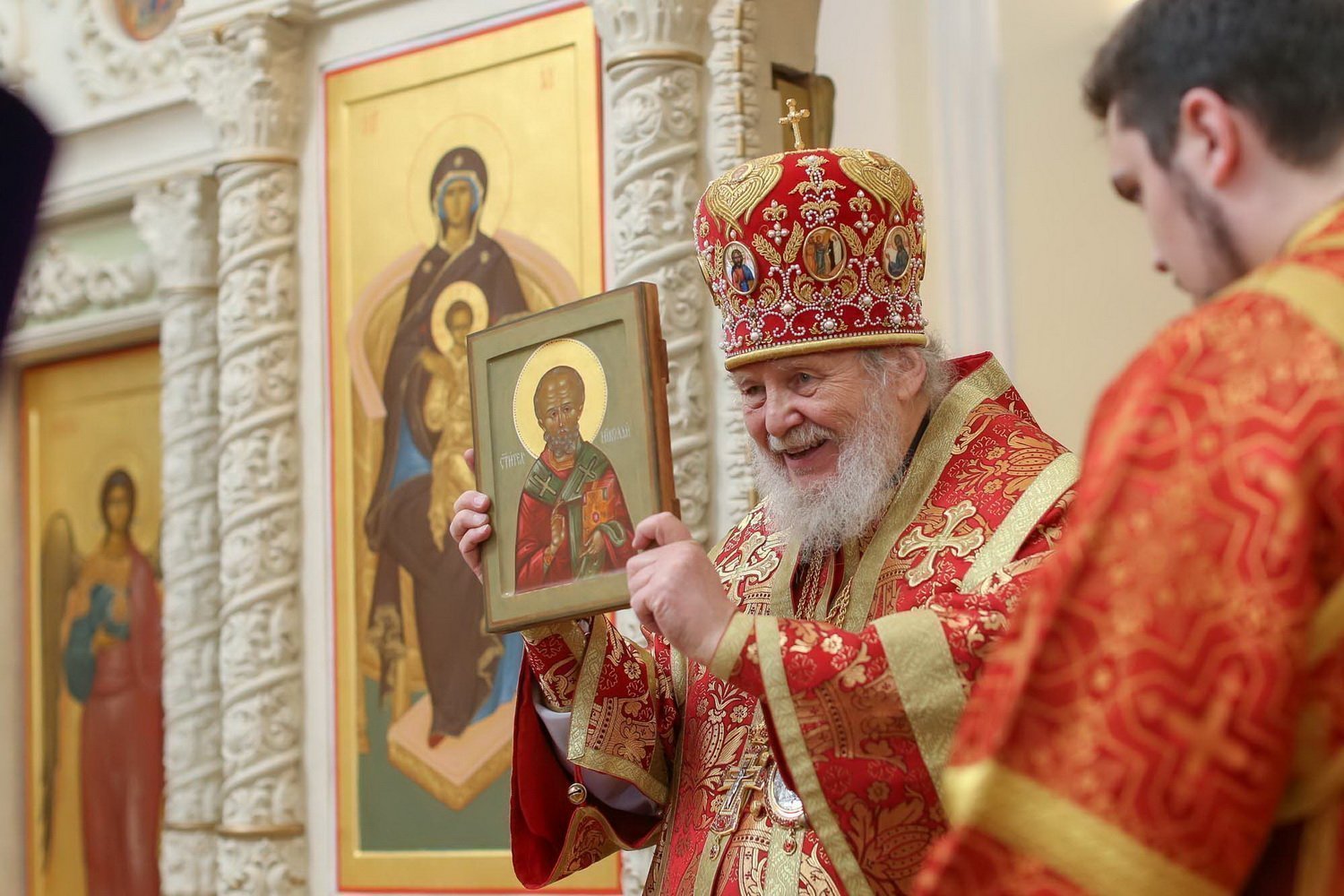 После отпуста отец Марк поздравил Владыку Николая с приближающимся днем рождения. Священник Максим Смирнов обратился к Его Преосвященству с приветствием, поблагодарил за совершенное богослужение и преподнес в подарок икону святителя Николая, написанную его супругой – матушкой Евфросинией.