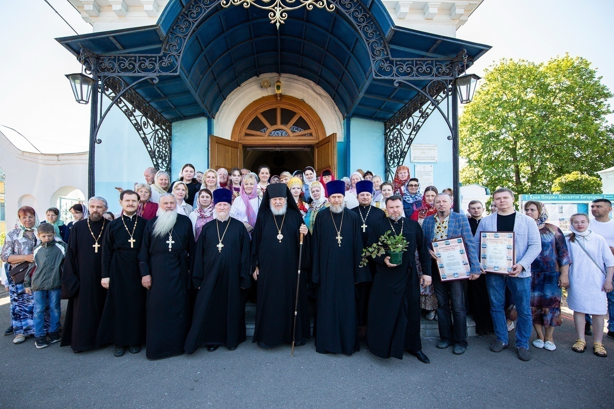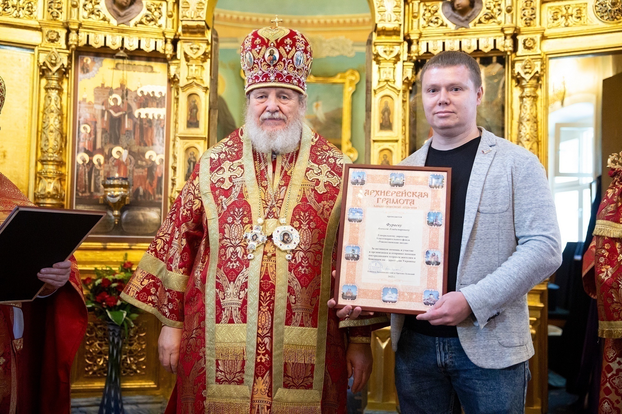 Затем Его Преосвященство обратился к духовенству и молящимся с архипастырским словом и вручил архиерейские грамоты Балашихинской епархии за активную помощь и участие в организации и отправке помощи мирным жителям и беженцам на территории Украины генеральному директору Благотворительного фонда «Рождественская звезда» А. В. Фураеву, учредителю группы компаний «ТРИОЛ» С. В. Кукушкину и генеральному директору предприятия «АММА» А. Н. Кукушкину.