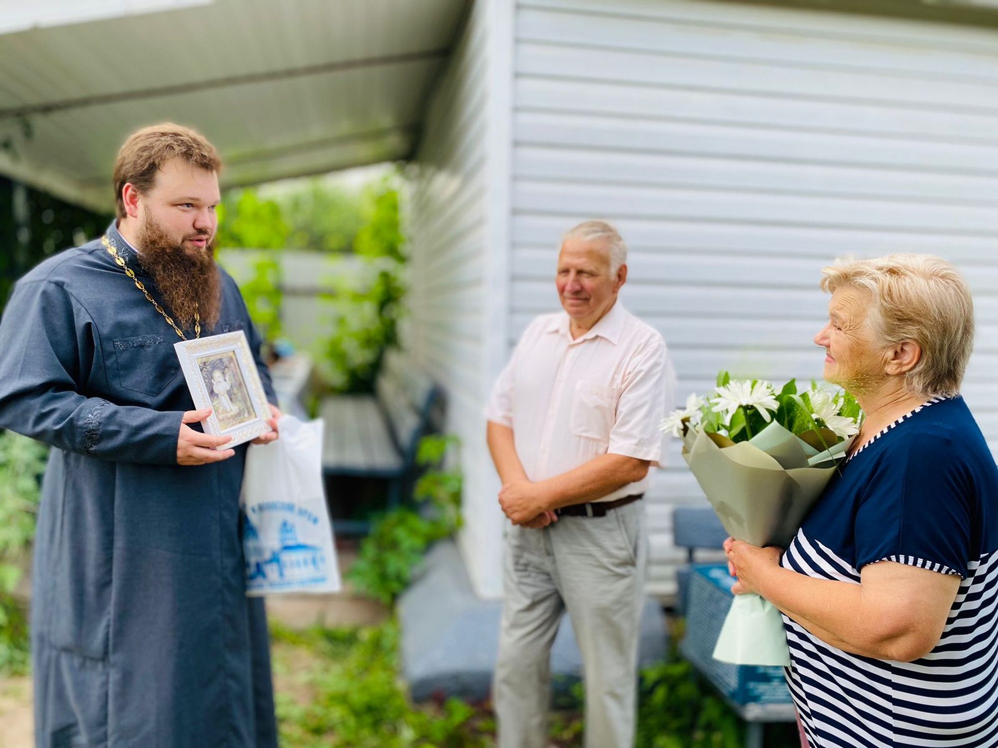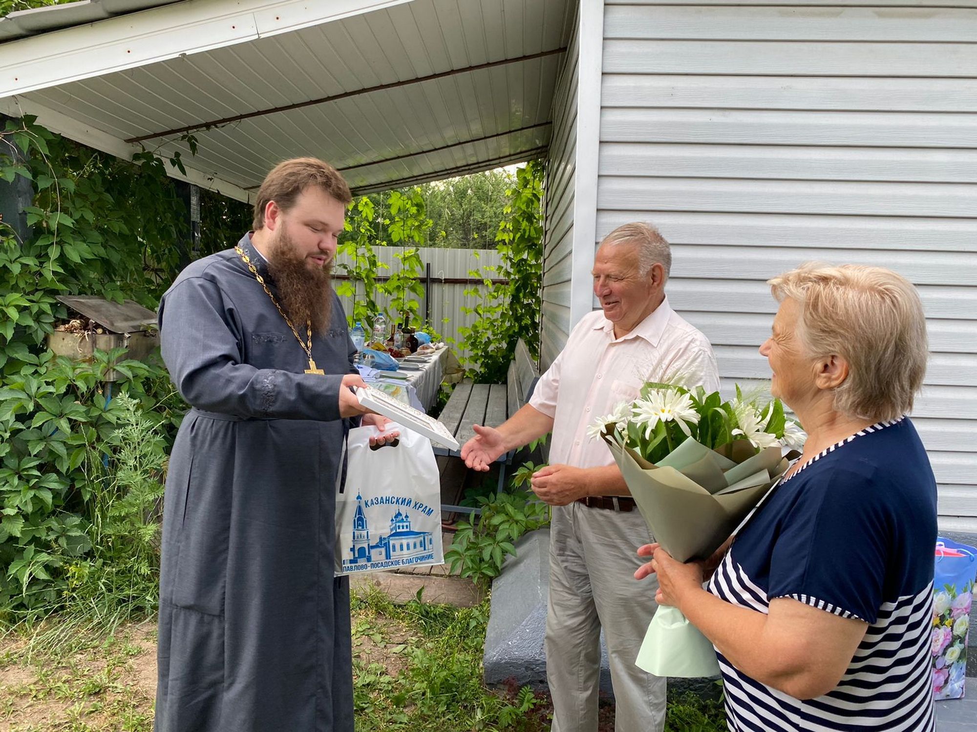 Отец Александр обратился к супружеским парам Моревых и Борисовых со словами поздравления и преподнёс подарки от Павлово-Посадского благочиния.
