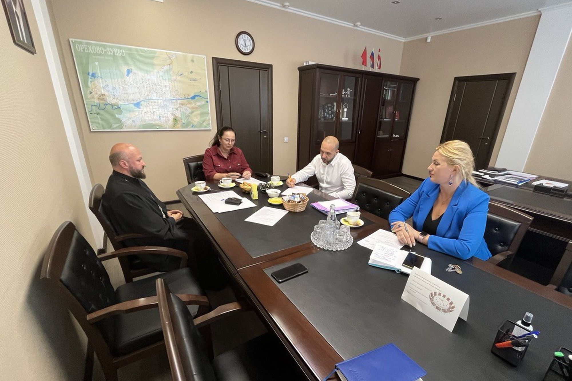 10 августа в администрации Орехово-Зуевского городского округа состоялась рабочая встреча благочинного церквей Орехово-Зуевского округа протоиерея Андрея Коробкова с главой городского округа Р.В. Заголовацким и его заместителями И. С. Кузнецовой и Т. И. Павловой.