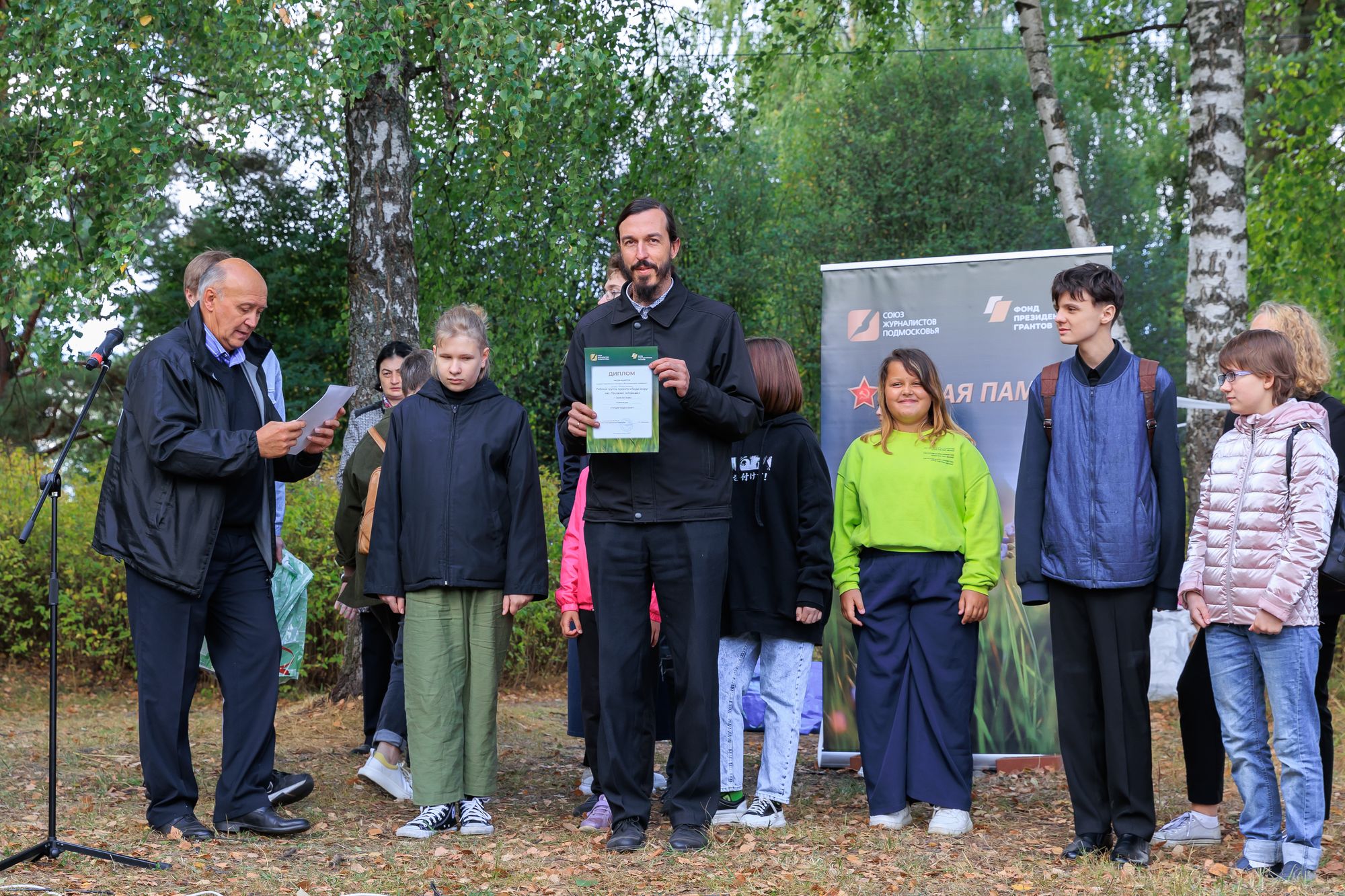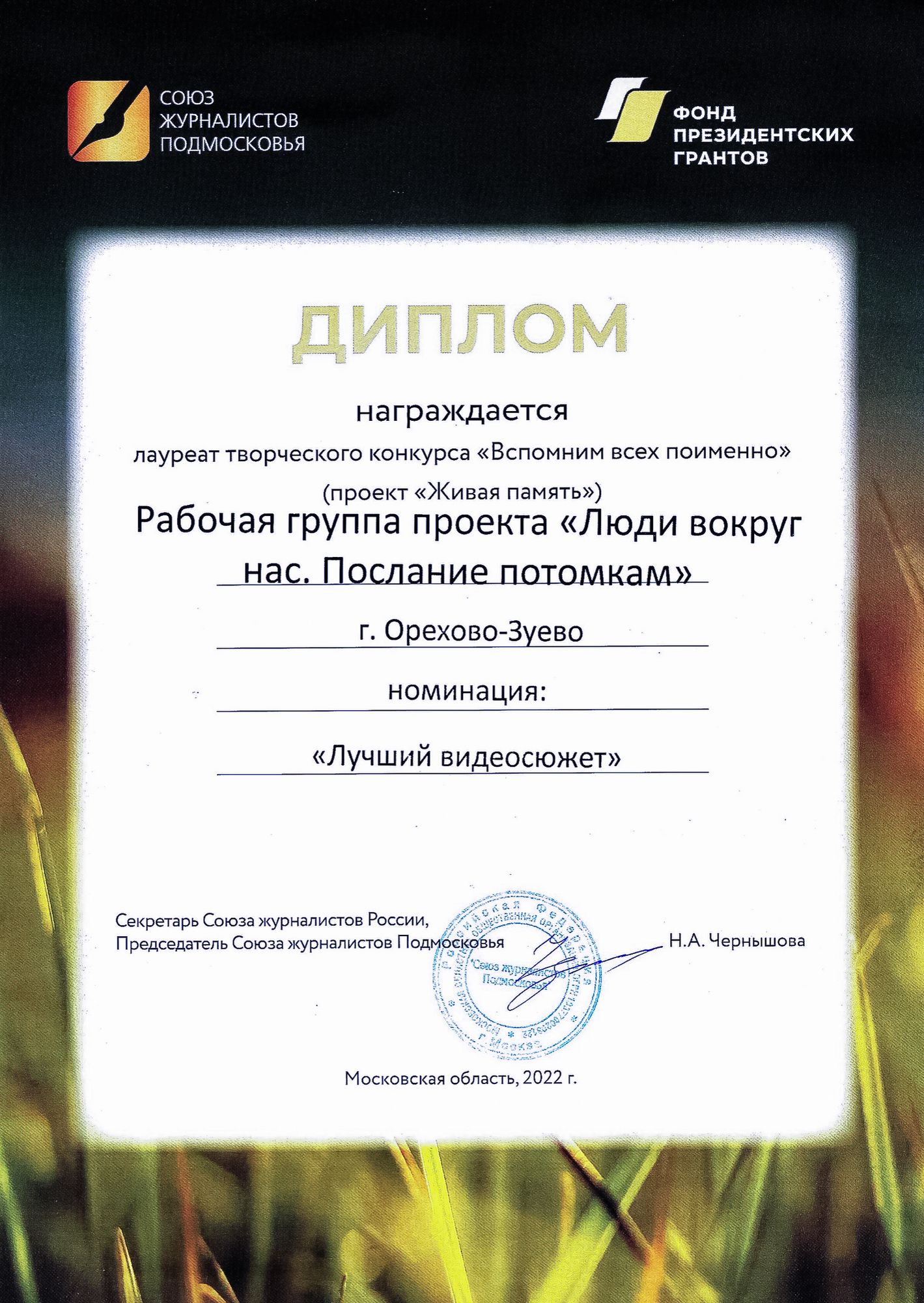 4 сентября завершилось итоговое мероприятие проекта Союза журналистов Подмосковья «Живая память», поддержанного фондом президентских грантов. Состоялось награждение победителей регионального творческого конкурса «Вспомним всех поимённо». В номинации «Лучший видеосюжет» диплом лауреата получила рабочая группа проекта «Люди вокруг нас. Послание потомкам» под руководством ответственного за миссионерскую работу в Орехово-Зуевском городском округе П.С. Королёва.