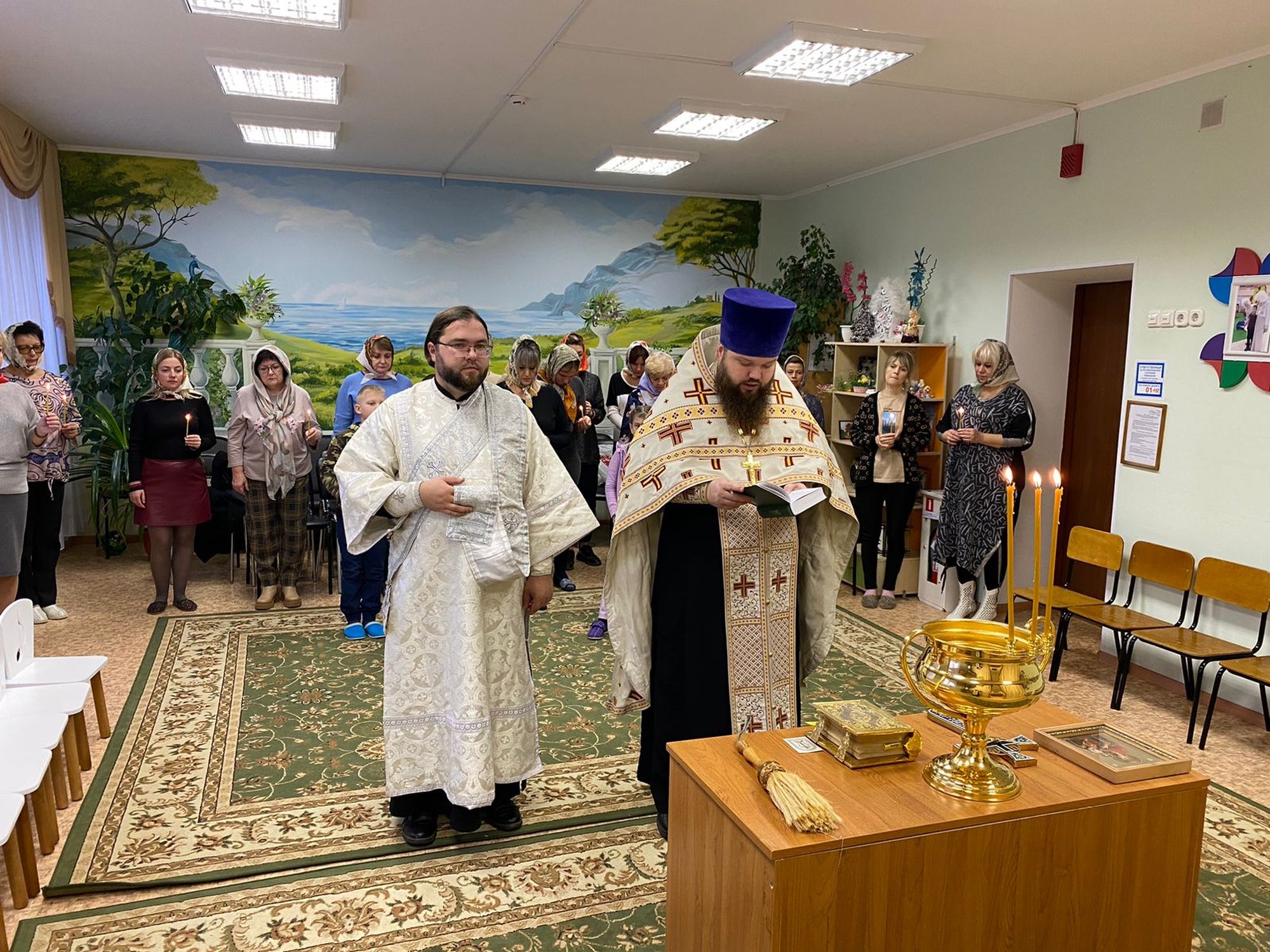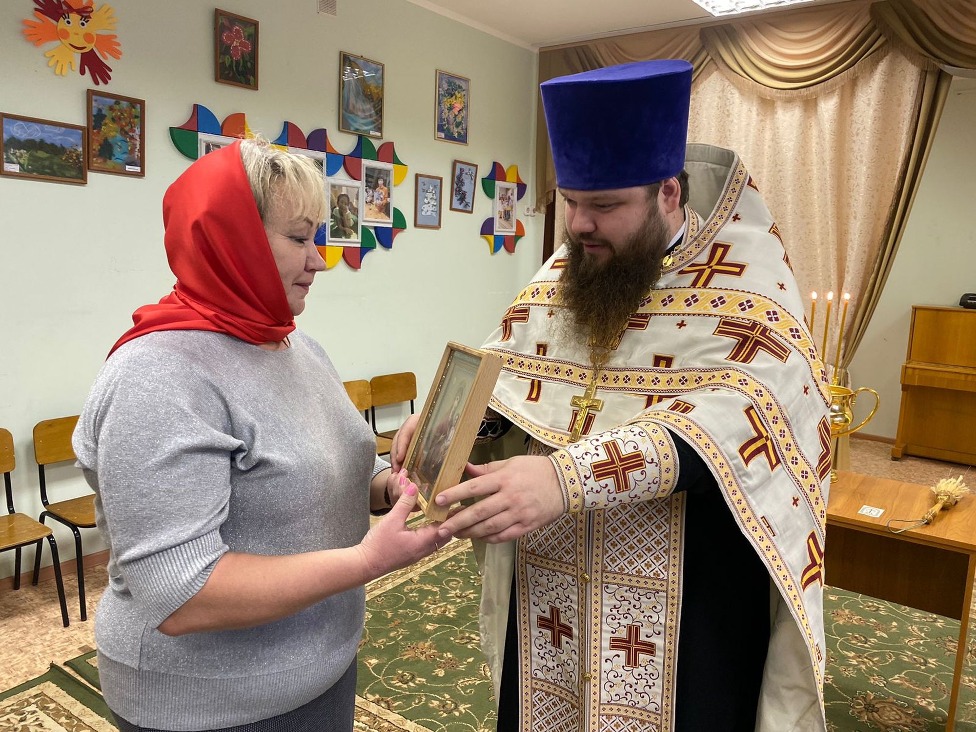 Отец Александр обратился к сотрудникам и воспитанникам центра с приветственным словом и передал заместителю директора Е. С. Лазаревой в благословение икону Пресвятой Богородицы.