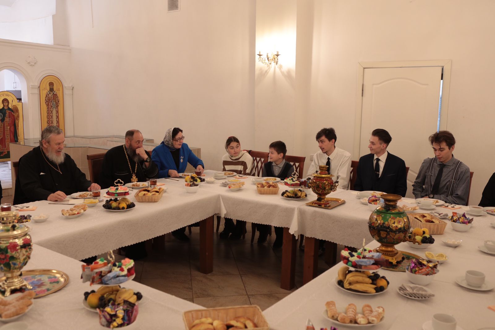 После награждения семьи священнослужителей протоиерея Владимира Владимирова, протоиерея Димитрия Марухина и священника Александра Кувшинникова смогли побеседовать с Владыкой Николаем за чашкой чая.