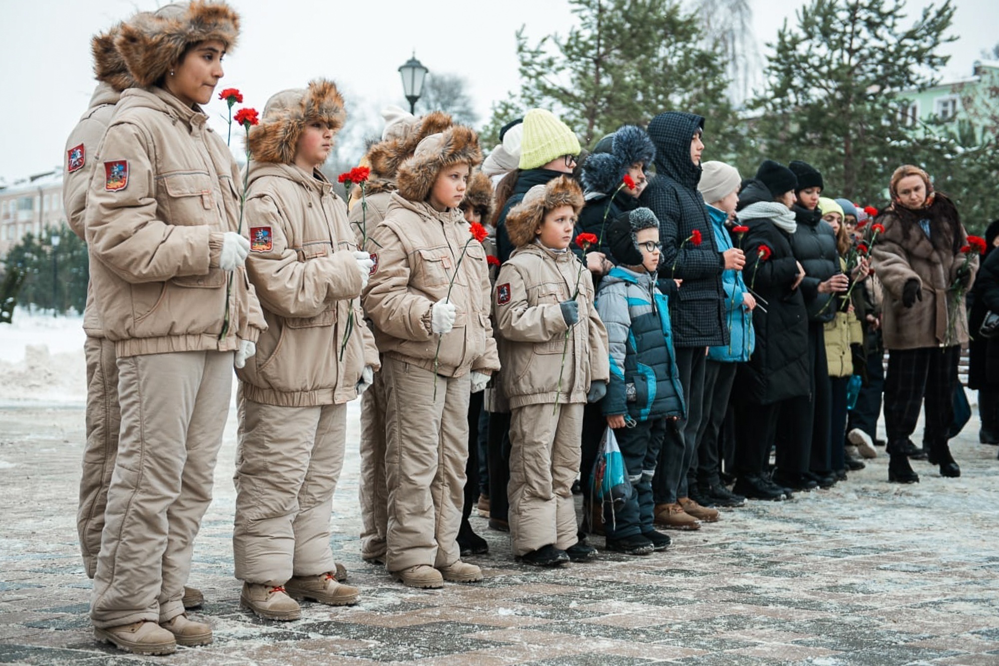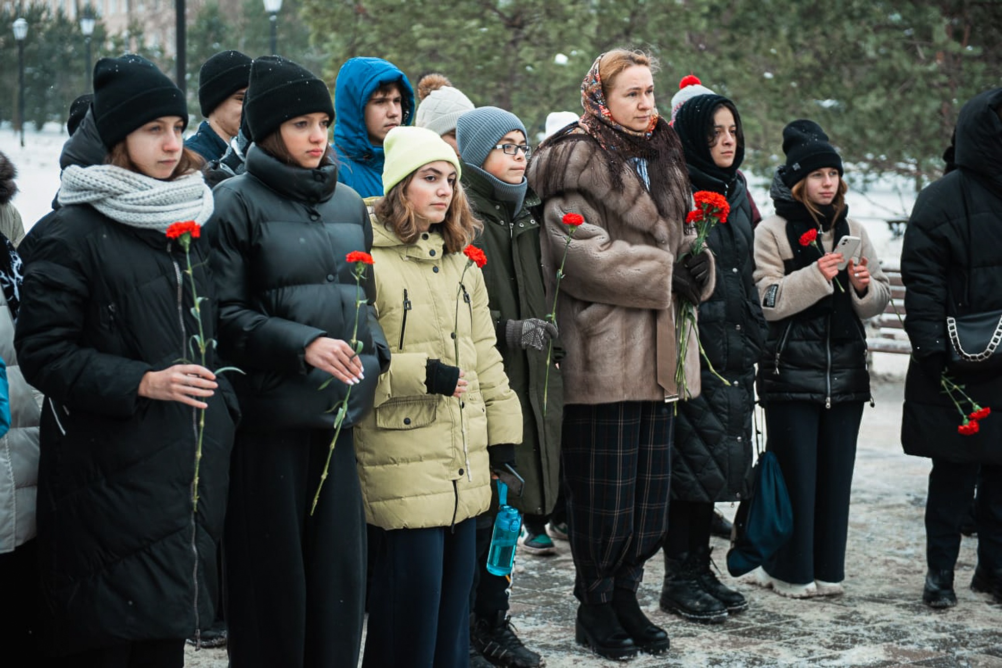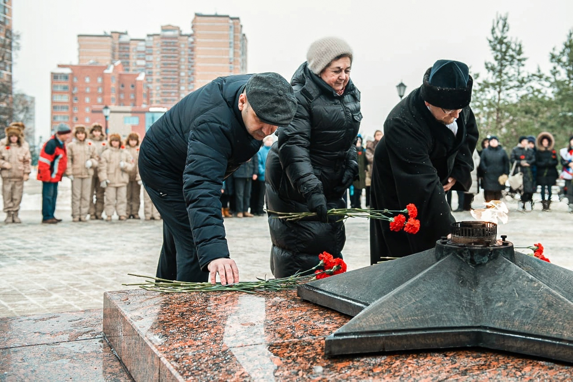 Ученики школ, представители администрации округа, добровольцы, священнослужители возложили цветы и почтили память павших минутой молчания.
